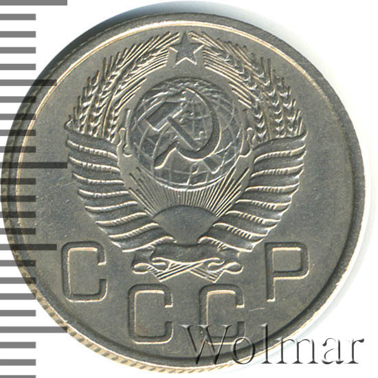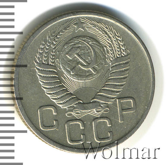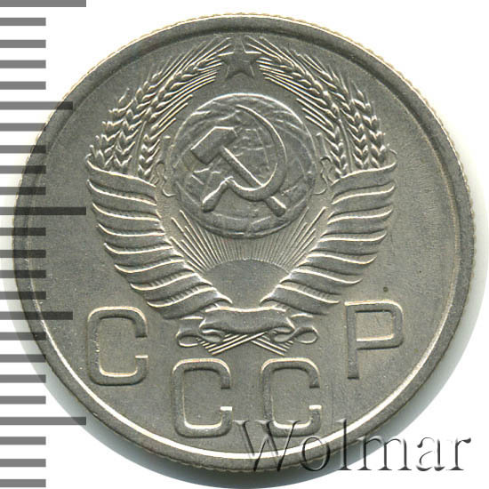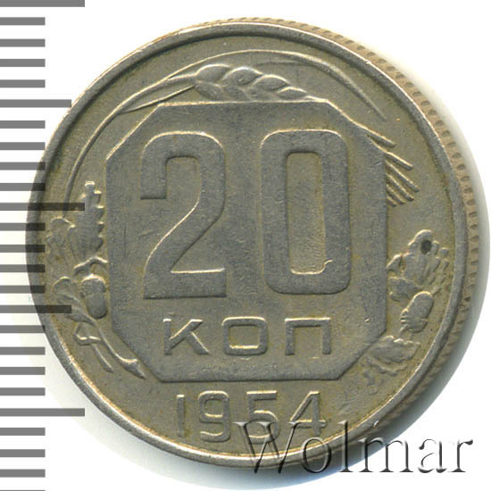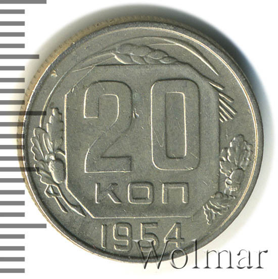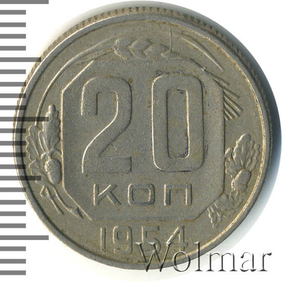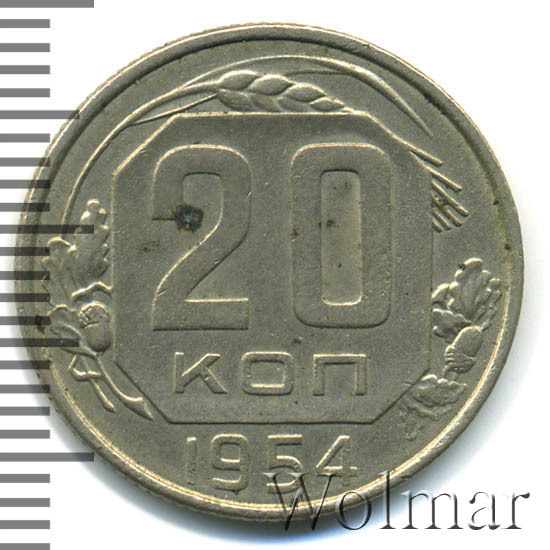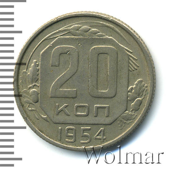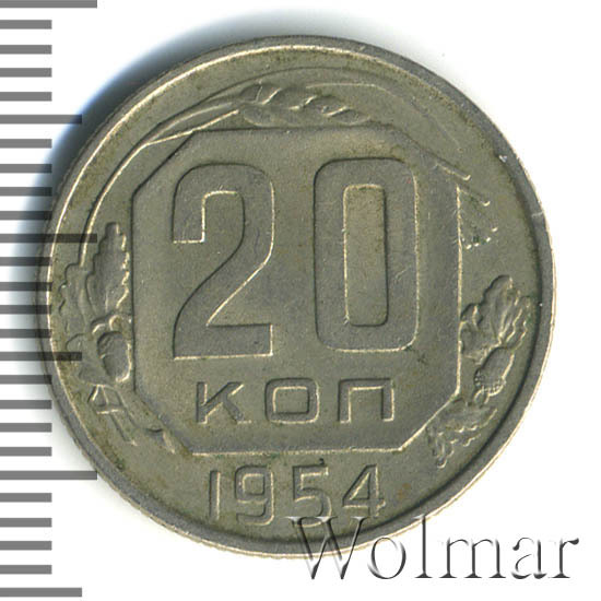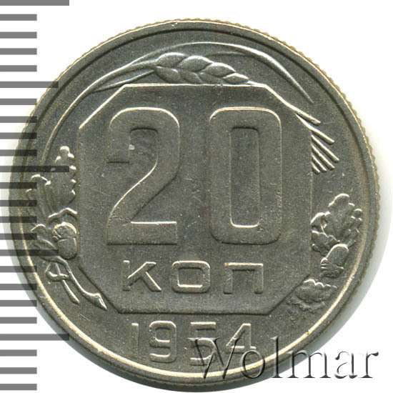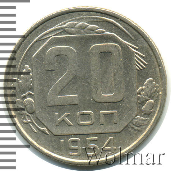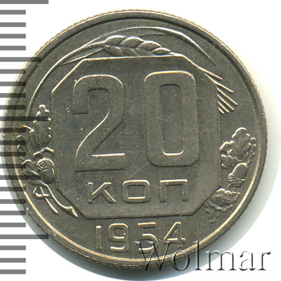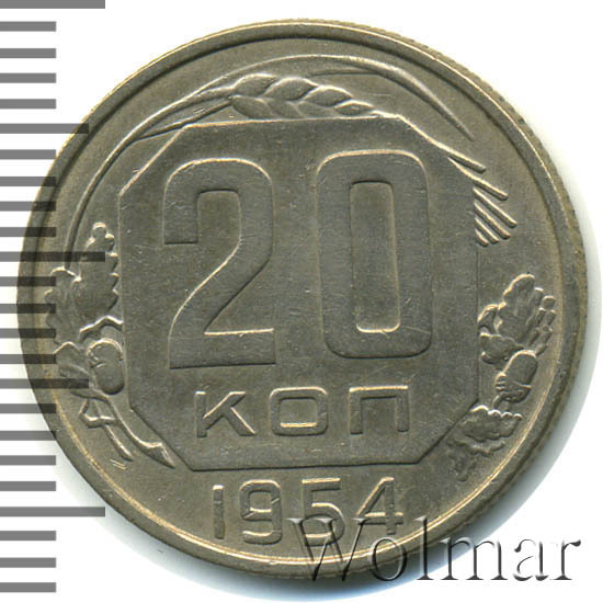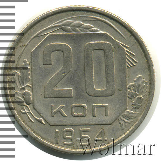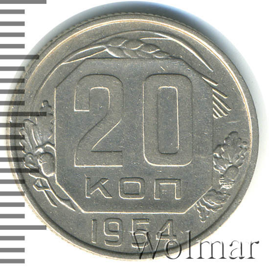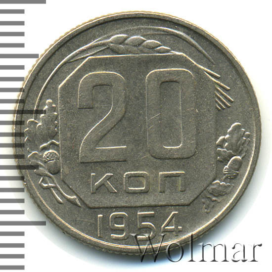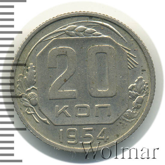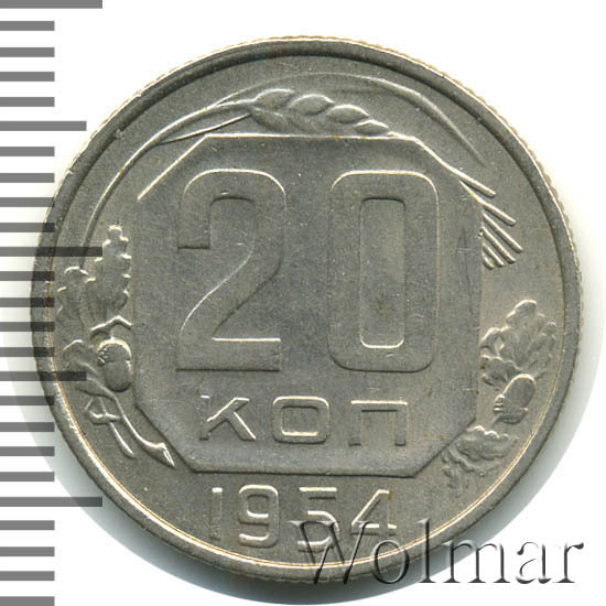Тиражная монета, номиналом в 20 копеек, один и 7 номиналов (от одной копейки до двадцати) отчеканенных в 1954 году (номиналы: 50 коп. и 1 рубль вновь были введены в обращение только в 1961 году). Отчеканена на Ленинградском монетном дворе. Материал чеканки – мельхиор, немагнитный сплав, белого цвета.