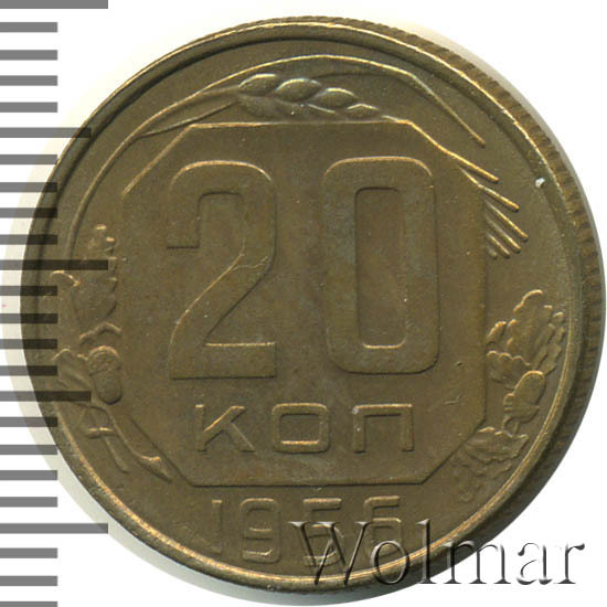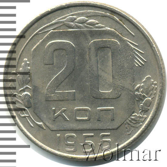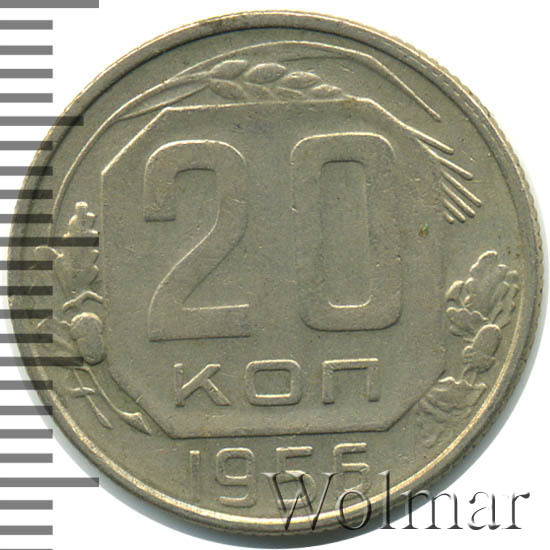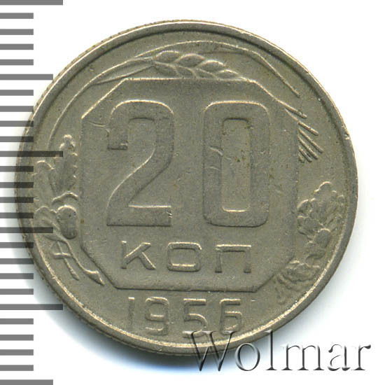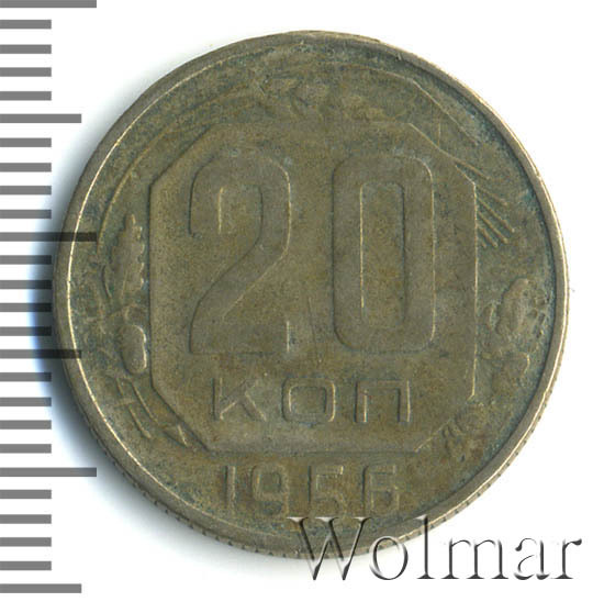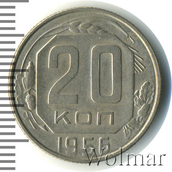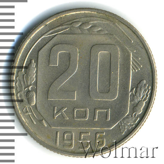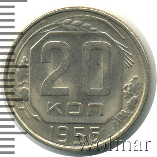 20 копеек 1956 года - тиражная, разменная монета, один из семи номиналов регулярного чекана, выпущенных в этом году. Чеканилась из сплава – мельхиор, немагнитного, белого цвета, на ЛМД (Ленинградский монетный двор), образца 1948 – 1957 годов. Расположение аверса к реверсу – медальное. Цена двадцати копеек 1956 г. не велика (очень большой тираж) и определяется коллекционным состоянием каждого, конкретного экземпляра. В отличном состоянии, без следов хождения в денежном обороте, в разы превышает стоимость монетки в среднем состоянии. Известных штемпельных разновидностей нет.