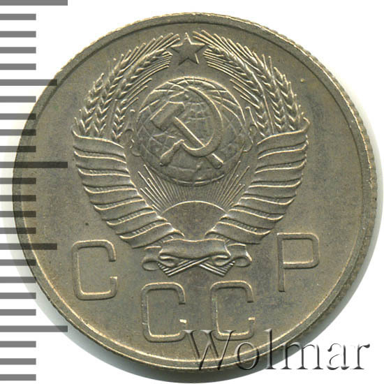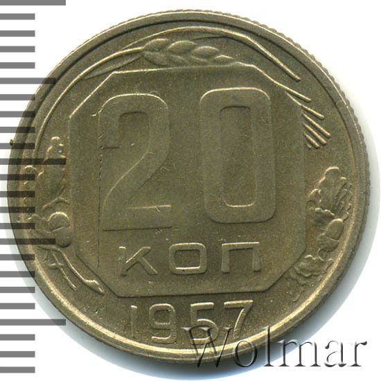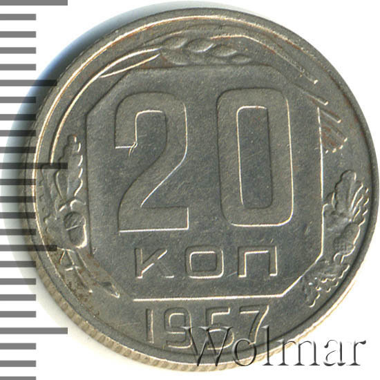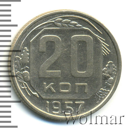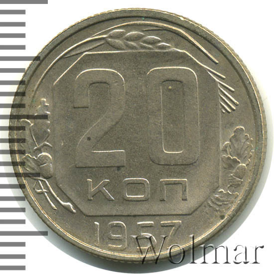 Последний год чеканки монет образца 1948 -1957 гг. для денежного обращения Советского Союза. 20 копеек - один и 7 номиналов отчеканенных в этом году (номиналы: 50 коп. и 1 рубль вновь были введены в обращение только в 1961 году). Производство Ленинградского монетного двора. Цена, в коллекционном состоянии UNC, не высока. Вариантов по сочетаниям аверса к реверсу (см. описание сторон монеты) – семь. Отметим самые редкие и дорогие (в денежном эквиваленте) из них: шт. 1.22А (Ф№109а), шт. 1.21А и шт. 1.11А (Ф№106а). Все эти три разновидности 20 копеек 1957 г. редки и цена на них, даже в среднем качестве, высока. В конце 1964 года, вышел годовой набор монет (качество чеканки обычное) 1957 г., в который помимо 20 коп., входили 5,10 и 15 копеек. Распространялся, этот набор, только за рубежом.