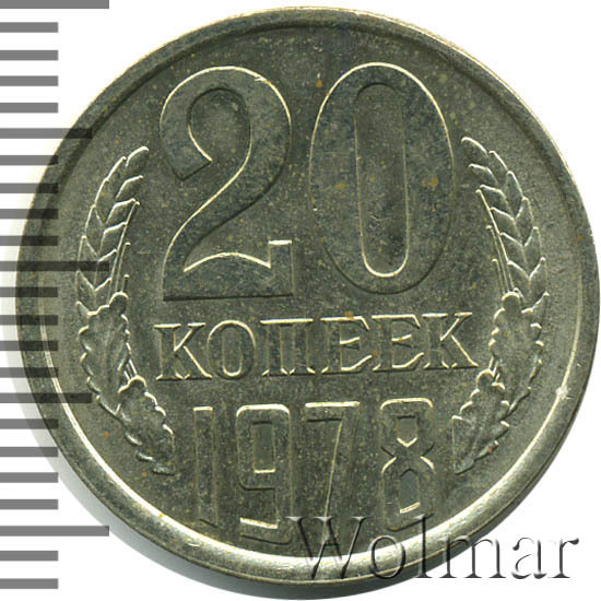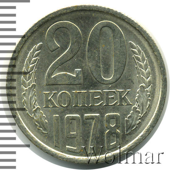 20 копеек 1978 выпускались из медно-никелевого немагнитного сплава белого цвета. Коллекционерам известны две штемпельные разновидности монеты. Выше представлена обычный не дорогой двугривенник, у него на лицевой стороне в гербе, вторые колосья не имеют остей (шт.1.2). Более редкой считается монета со штампом аверса от 3 копеек 1978 года или, так называемая, "перепутка"(шт.3.1) , у неё вторые колосья уже с остями. Подробнее ознакомиться с разновидностями и стоимостью 20 копеек 1978г. поможет наш каталог, составленный по результатам торгов на ведущих российских нумизматических аукционах.