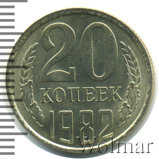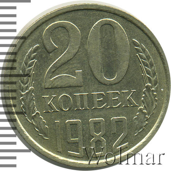 Тиражная, разменная монета денежного обращения Советского Союза. Один из девяти номиналов, отчеканенных в этом году монет различного качества: для обращения и, улучшенного, для годовых наборов ГБ СССР. Цена на эти 20 коп. невелика, как у наборных, так и у монет обычного качества чеканки. Объясняется огромным тиражом, практически в любой копилки с мелочью СССР, Вы легко отыщете данную монетку. Три разновидности, "перепутки" – аверс трёх копеечных монет образца 1978, 1979 и 1981 гг., вынесены нами на отдельную страницу. На этой странице Вы сможете узнать цену и результаты проходов по этим не частым "перепуткам" 20 копеек 1982 года.