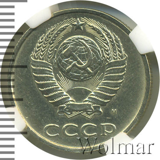 Штемпель 3.3. герб приподнят к выступающему канту монеты, между вторым и третьим колосом нет выходящей ости, на африканском континенте Гвинейский залив четко выражен, герб СССР - 15 витков ленты. Буква М