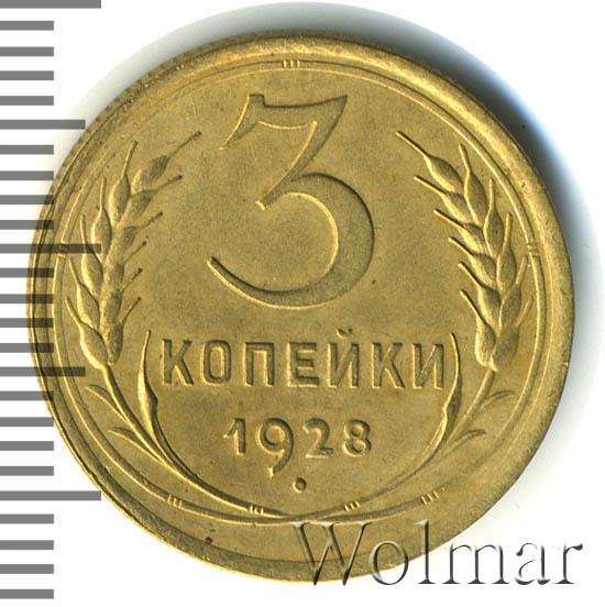 3 коп. 1928 г. принадлежат типу разменных бронзовых монет образца 1926 – 1935 гг. Материал изготовления: алюминиевая бронза, желтого цвета. Отношение гербовой и оборотной сторон (аверса к реверсу) – медальное. Тираж доподлинно не известен, но можно сказать об этих трёх копейках, что, по встречаемости, довольно простая, рядовая монета. Цена на 3 коп. 1928 г. определяется в зависимости от состояния монеты. Представляет интерес для нумизматов в качестве AU и выше. Довольно редкая разновидность три копейки 1928 г. с лицевой стороной от 20 копеек 1924 г.(Ф№17) , рассматривается на отдельной странице каталога. Цена на разновид более пятидесяти раз превосходит стоимость обычной 3 коп. 1928 г.