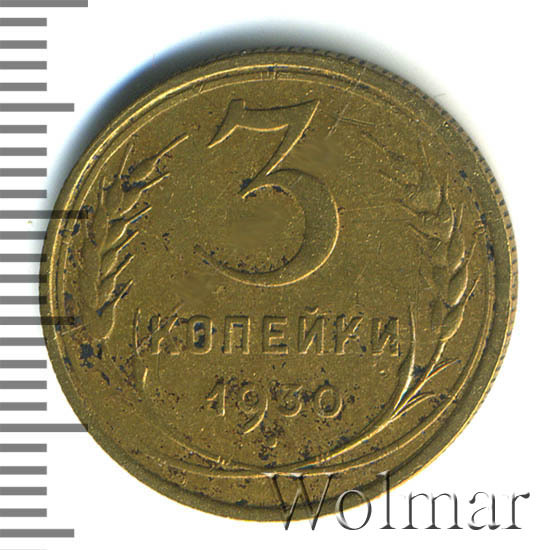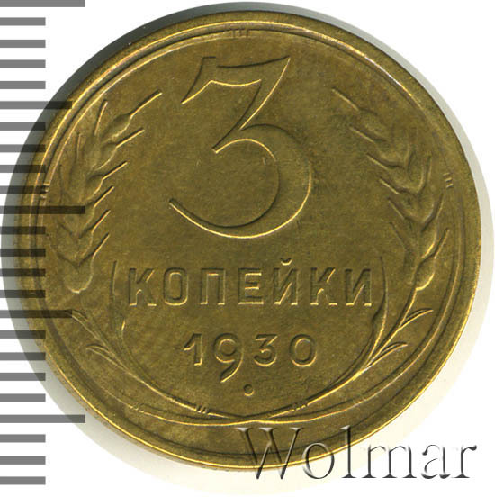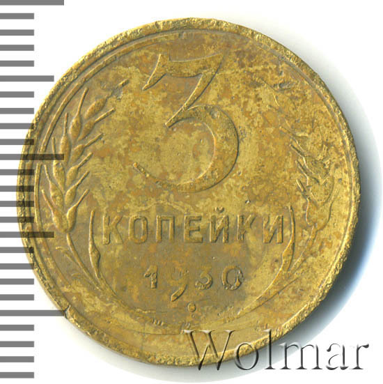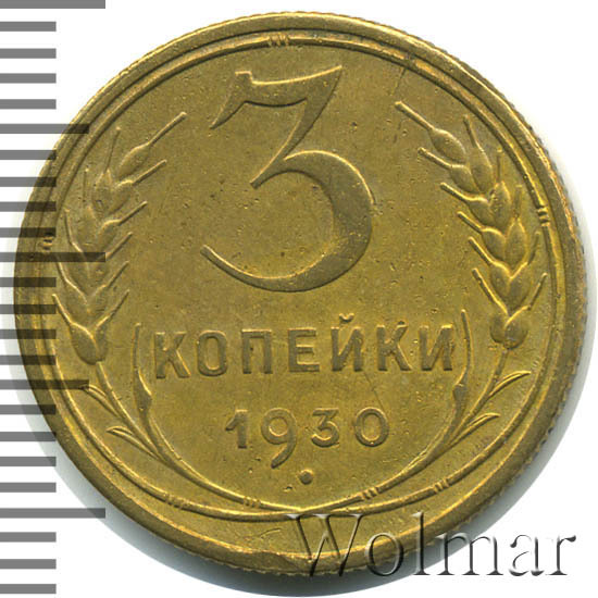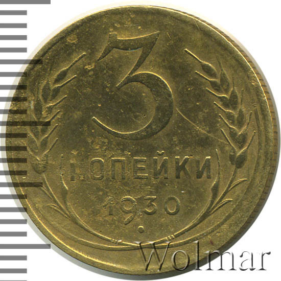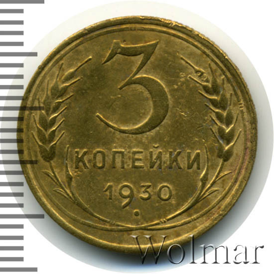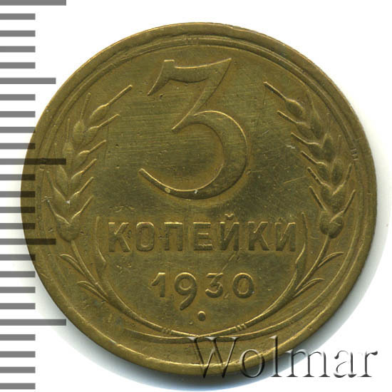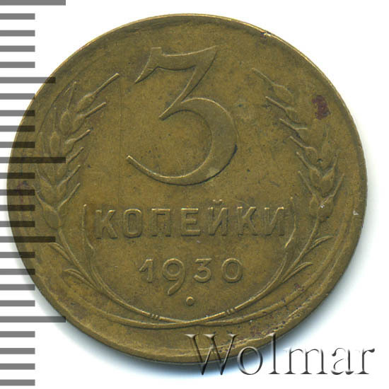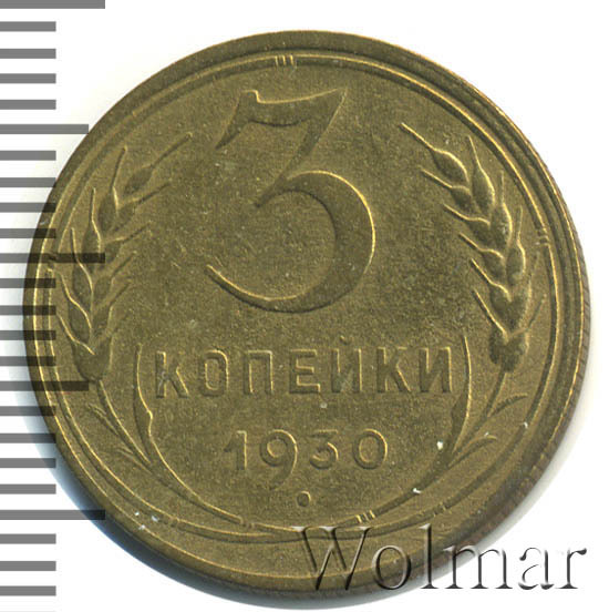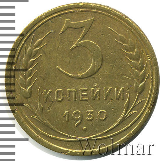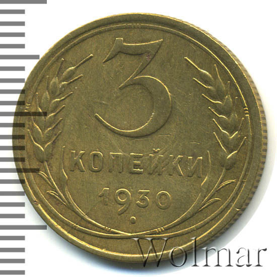 Цена 3-х копеек 1930г. обычно не велика, нумизматы считают монету довольно распространённой. Известна единственная редкая и дорогая разновидность - лицевой штамп от 20 копеек 1924г. - буквы СССР вытянутой формы.