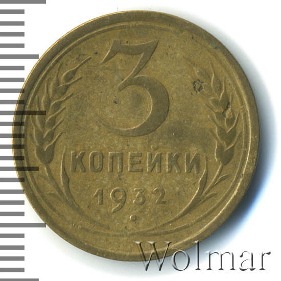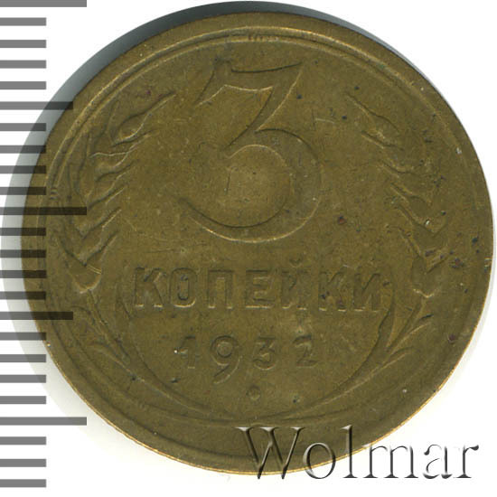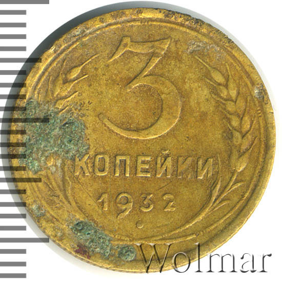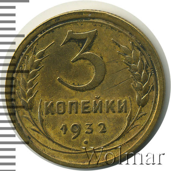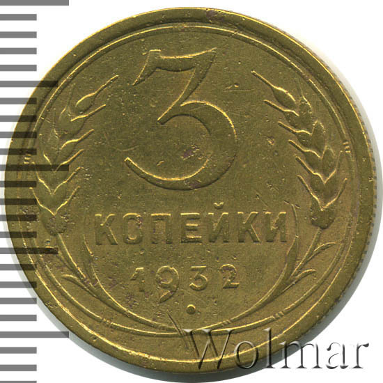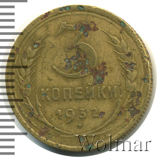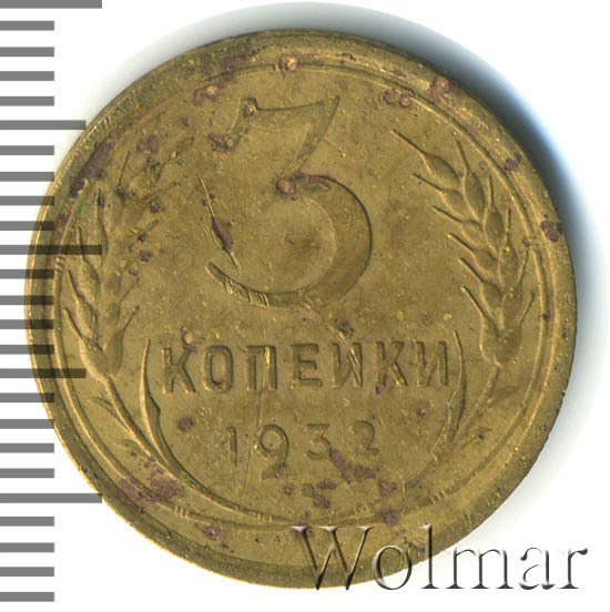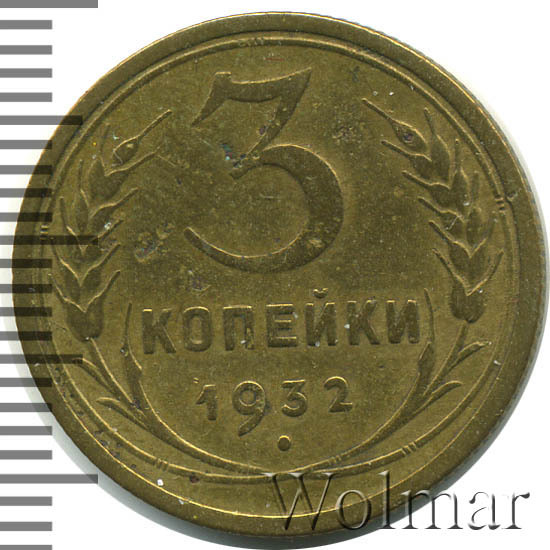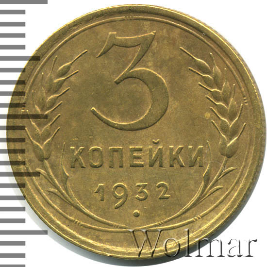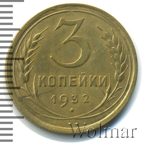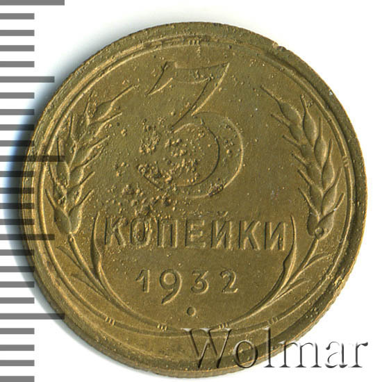 3 копейки 1932 г. Тип 1931 – 1935. Тираж: 37718 тысяч штук. В пятидесятых годах был произведён новодельный чекан (Ф№25Н). В обороте не встречается. Цена на новодел отличается (в большую сторону) от стоимости 3 коп. 1932г. в сотни раз. Разновидность: 3к32 вместо букв "СССР"- черта, рассматривается отдельно. Узнать актуальную стоимость на 3 копейки 1932г. можно на странице ниже, по нашему каталогу проходов и цен, отмеченных на торгах самых популярных нумизматических аукционов.