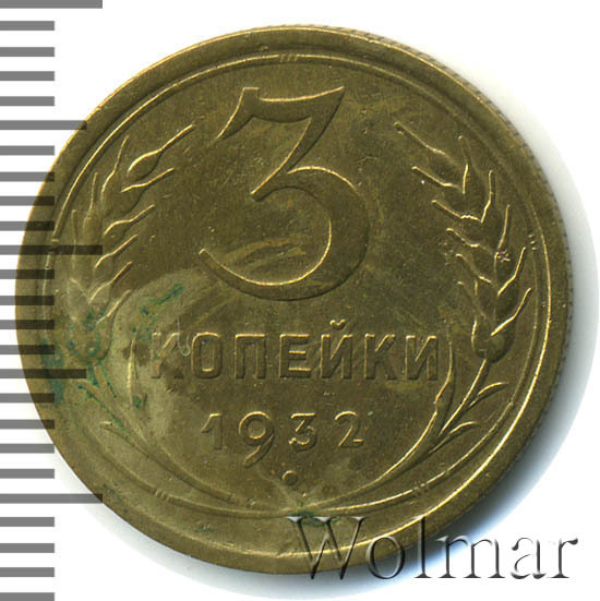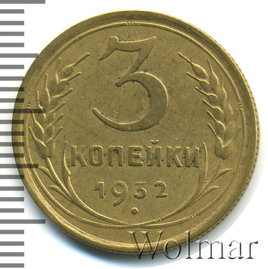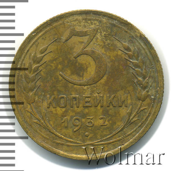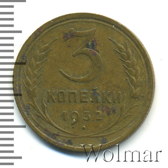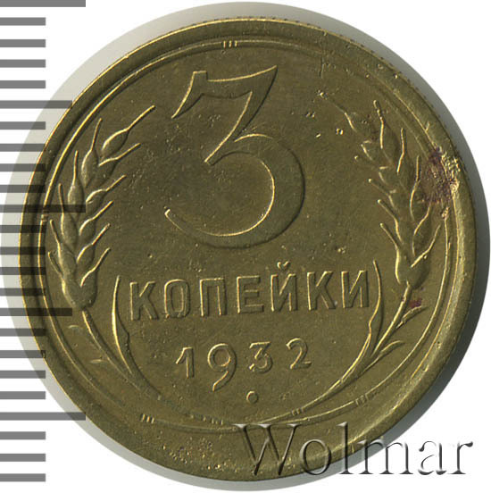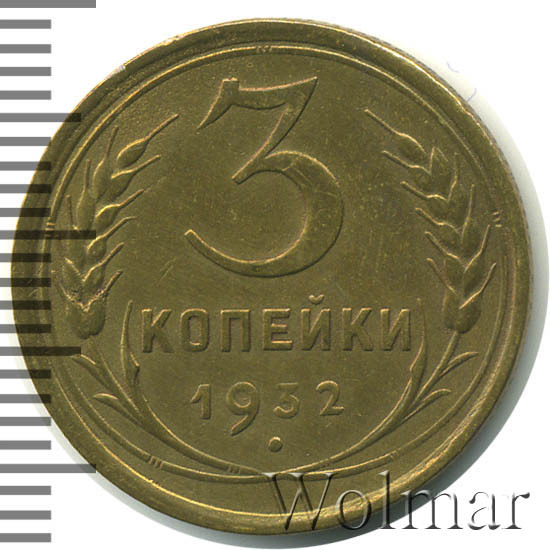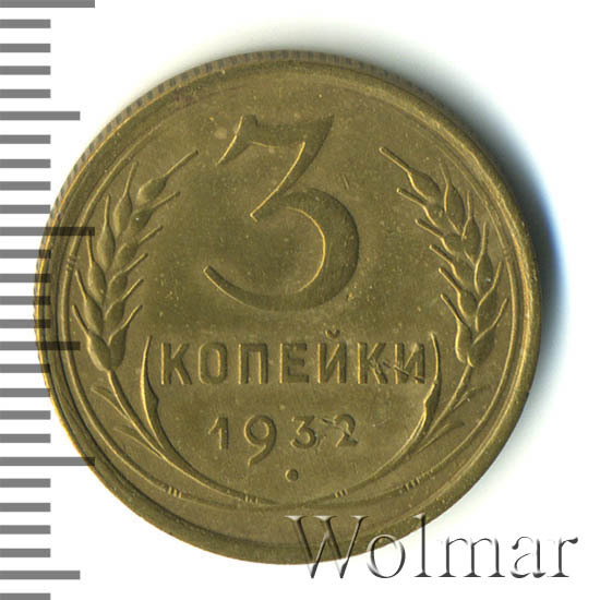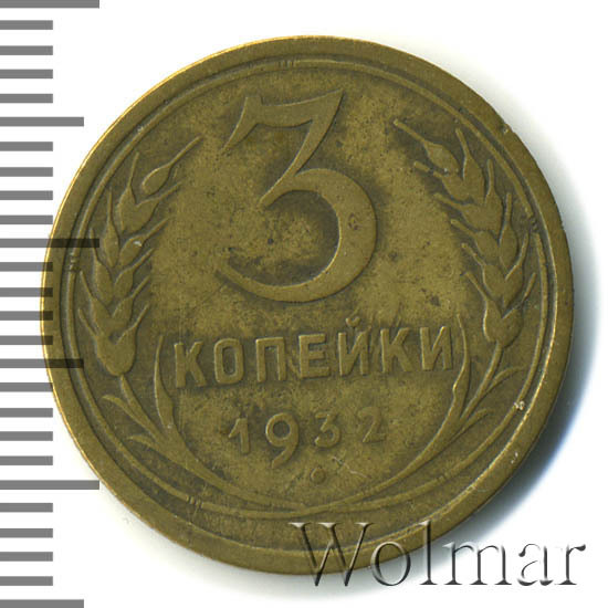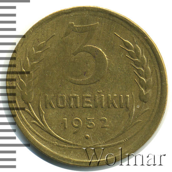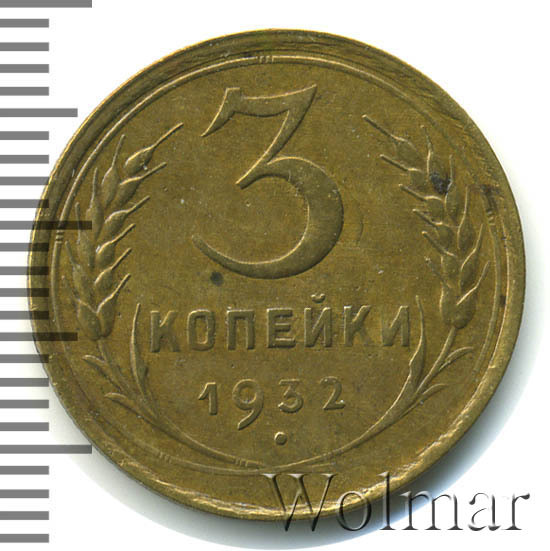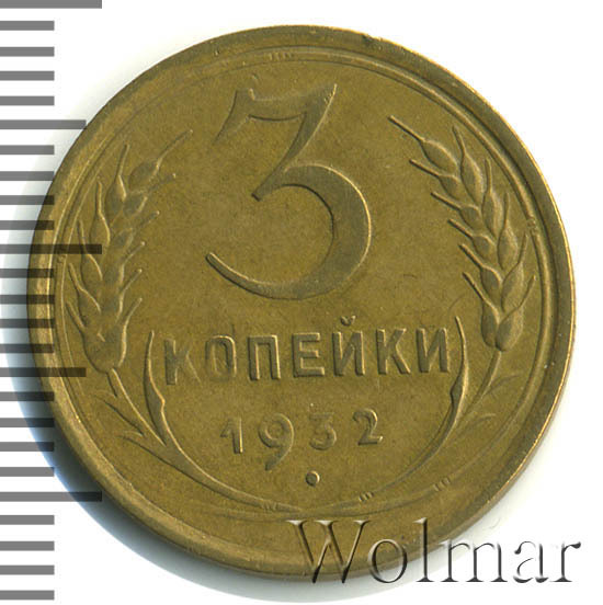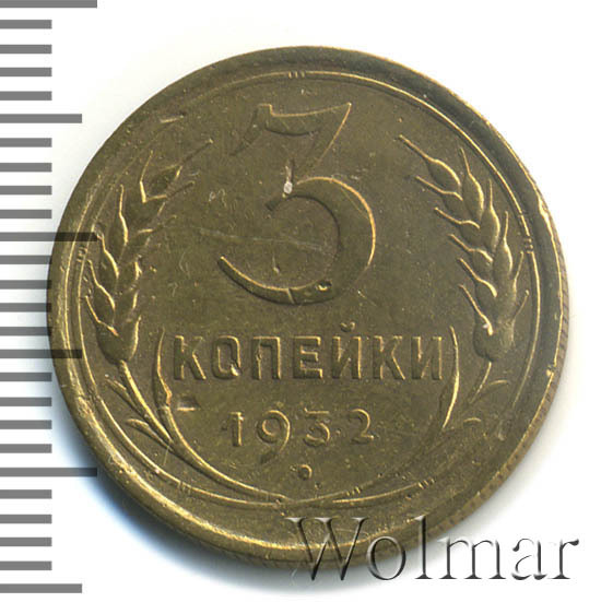 3 копейки 1932 г. Тип 1931 – 1935. Тираж: 37718 тысяч штук. В пятидесятых годах был произведён новодельный чекан (Ф№25Н). В обороте не встречается. Цена на новодел отличается (в большую сторону) от стоимости 3 коп. 1932г. в сотни раз. Разновидность: 3к32 вместо букв "СССР"- черта, рассматривается отдельно. Узнать актуальную стоимость на 3 копейки 1932г. можно на странице ниже, по нашему каталогу проходов и цен, отмеченных на торгах самых популярных нумизматических аукционов.