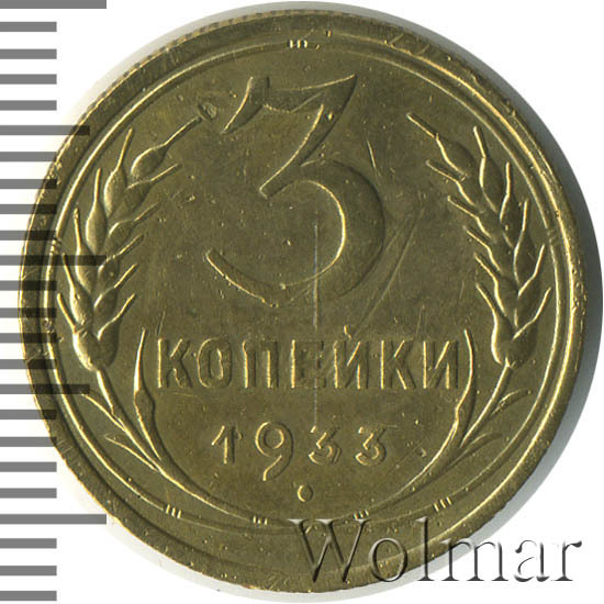 - Три тройки на реверсе. Стоимость монеты 3 копейки 1933 года