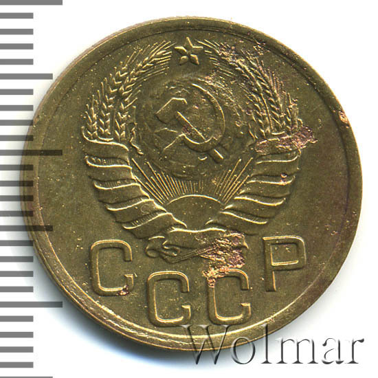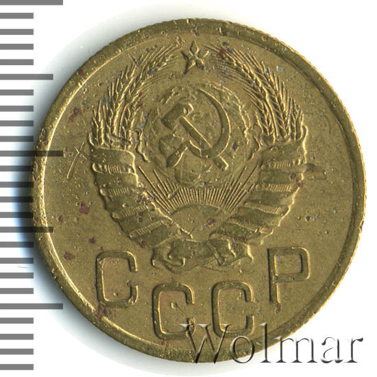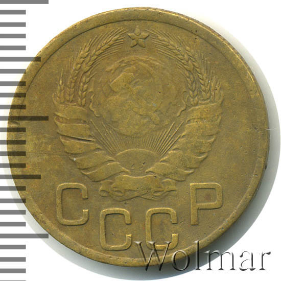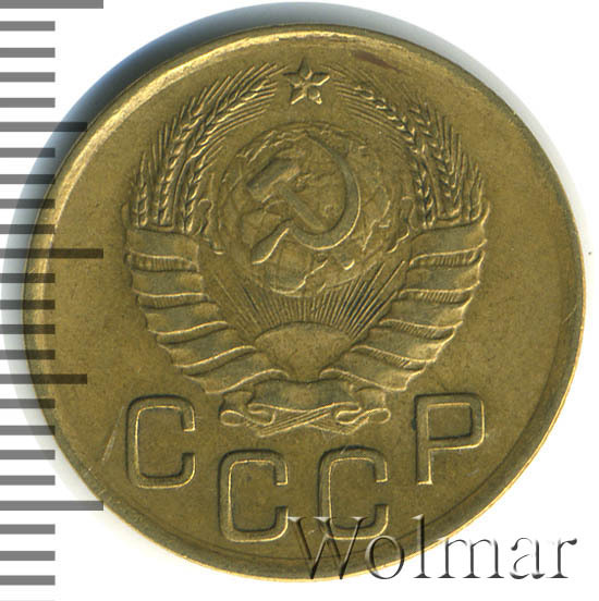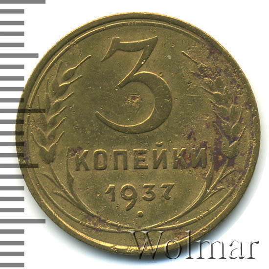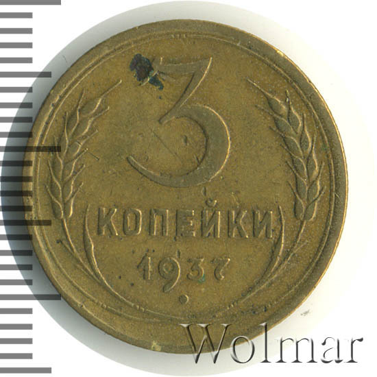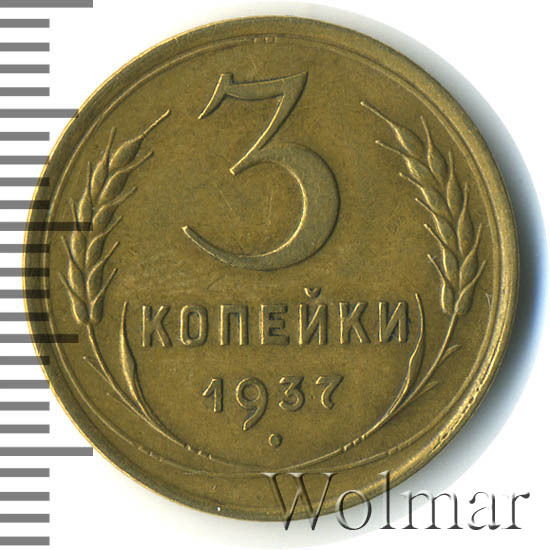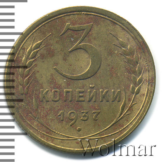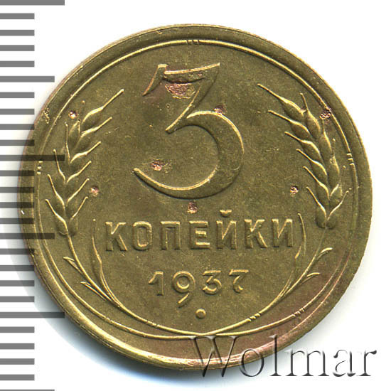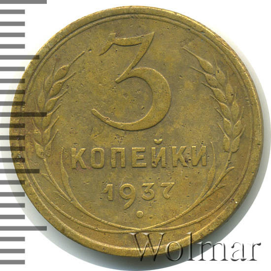 Разменная монета для денежного обращения Советского Союза. Тип бронзовых монет 1937 – 1946 гг. Дизайн Государственного Герба с 11 связующими лентами. Отчеканены 3 копейки 1937 г. как и остальные шесть номиналов монет этого года на Ленинградском монетном дворе. Цена на три коп. 1937 г. зависит от коллекционного состояния.