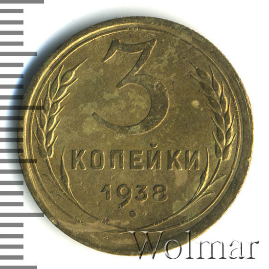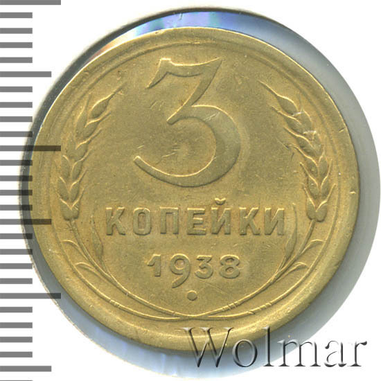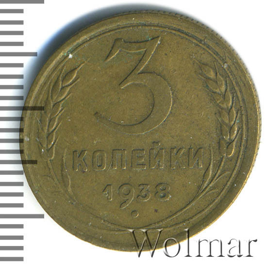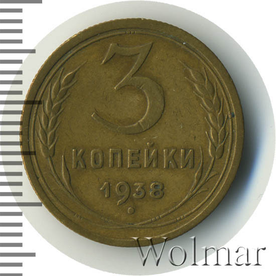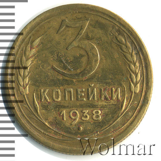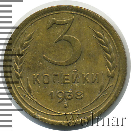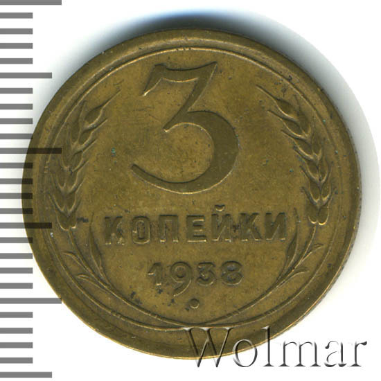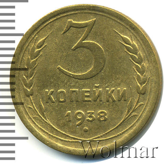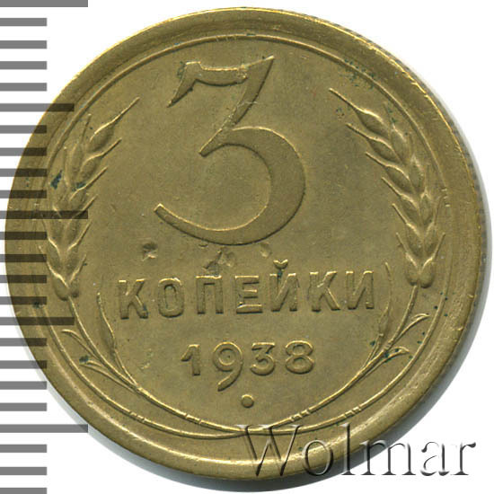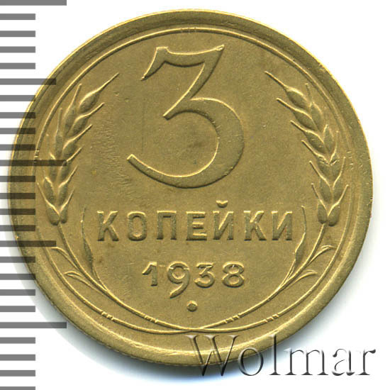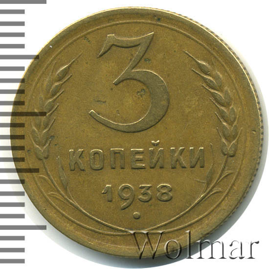 Разменная монета Советского Союза номиналом в три копейки. Чеканка ЛМД (Ленинградского монетного двора). Один из 7 номиналов отчеканенных в 1938 году. Тип бронзовых трёхкопеечных монет образца 1935 – 1946 гг. Материал изготовления: алюминиевая бронза, немагнитная, желтого цвета. Тираж не известен.