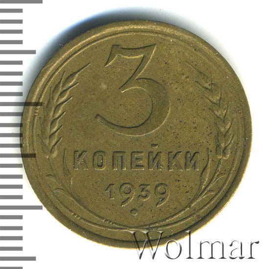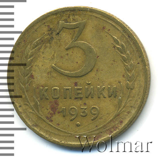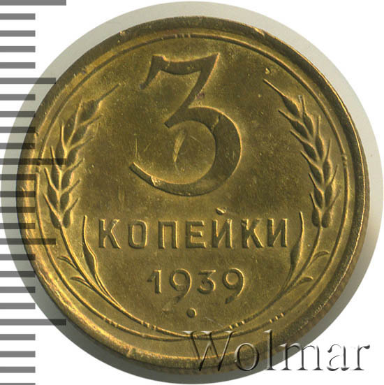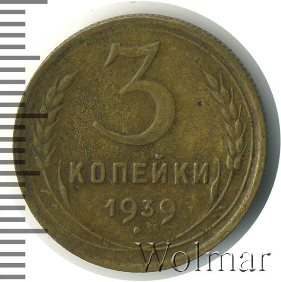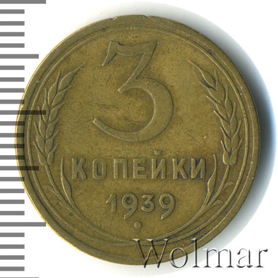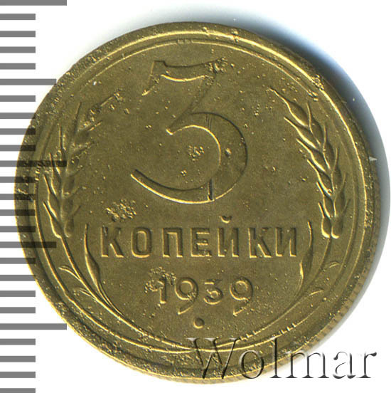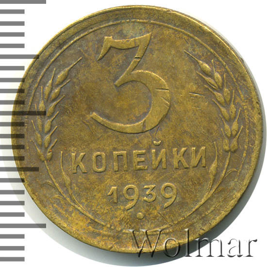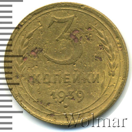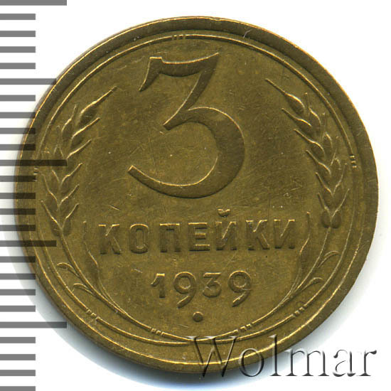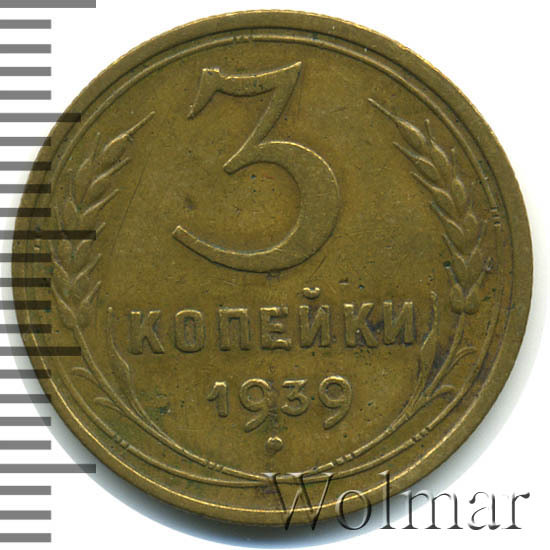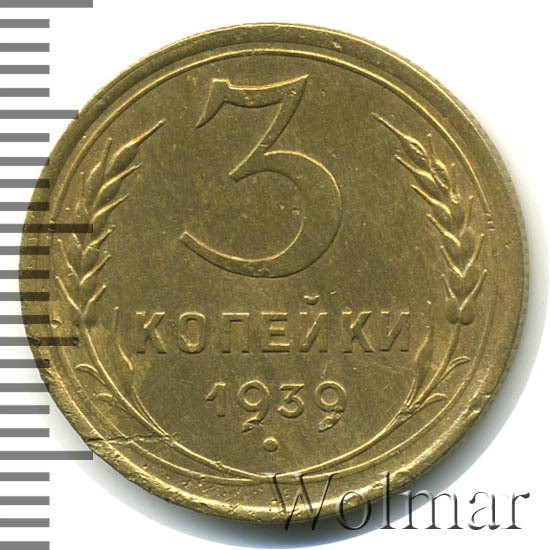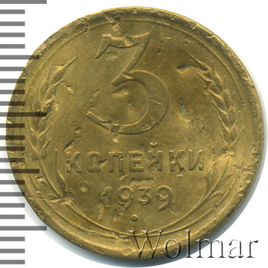 Разменная монета для денежного обращения Союза Советских Социалистических Республик. В 1939 году, на Ленинградском монетном дворе, было отчеканено 7 номиналов разменных денег (от одной до двадцати копеек). Три копейки 1939 г. относится к типу бронзовых трёхкопеечных монет образца 1937 – 1946 гг. Материал изготовления: немагнитный сплав алюминиевой бронзы, жёлтого цвета. Отношение гербовой стороны и оборотной – медальное (0 градусов). Тираж доподлинно не известен. Известных штемпельных разновидностей (см. описание аверса и реверса) – девять. Самые редкие из них: лицевая сторона шт. 1.1 узлы "Ж" и два варианта с аверсом от 20к37 (маленькая, плоская звезда). О цене: разновид с редким узлом, дороже обычной 3 копейки 1937 в сотни раз, а с "лицевиком" двадцати копеек – в тысячу. Надо отметить, что из двух разновидов с аверсом двадцати копеек, реже встречается шт. 20к37Б (Ф№65).