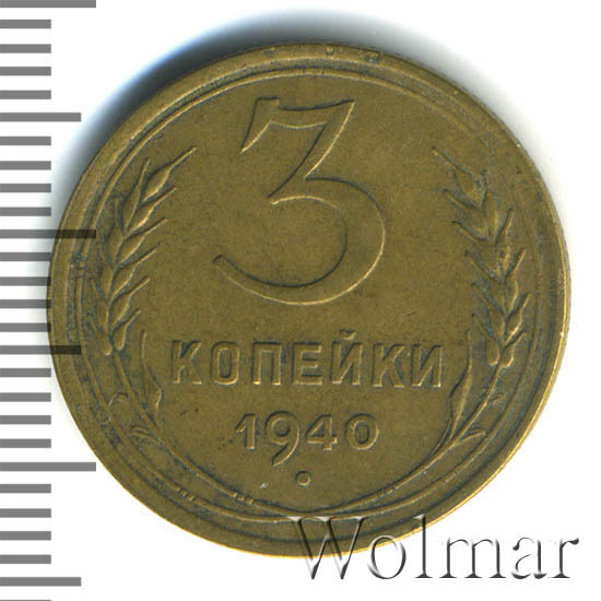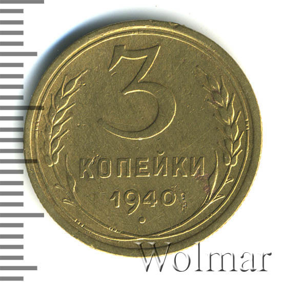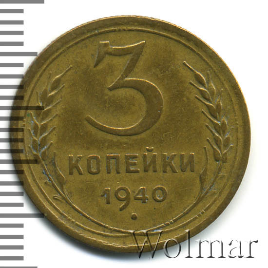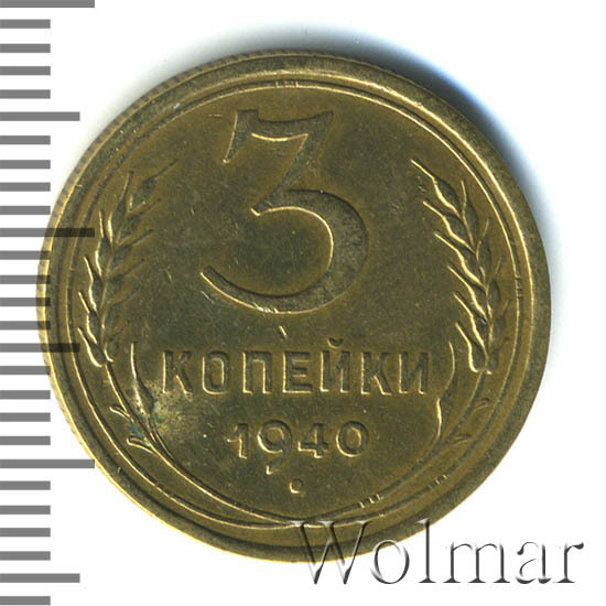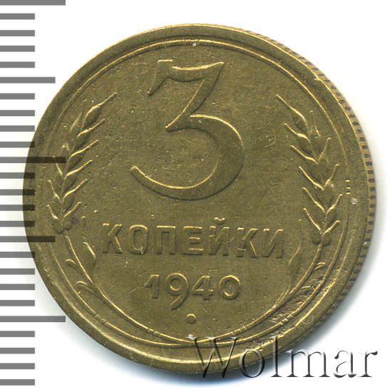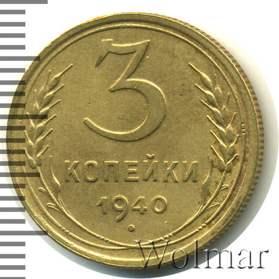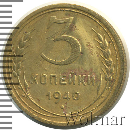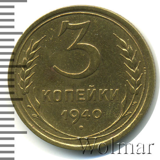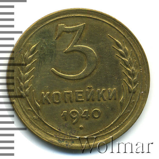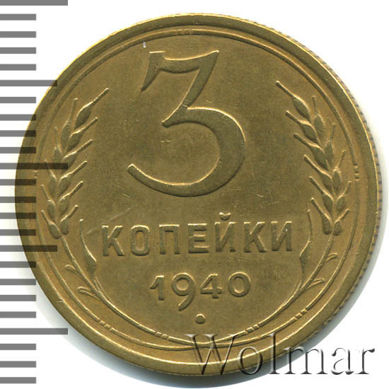 Разменная монета Советского Союза номиналом в три копейки, предвоенного выпуска 1940 года. Чеканка ЛМД (Ленинградского монетного двора). Цена трёх копеек 1940 г. не велика, нумизматы по праву считают эту монету довольно распространённой. Известных разновидностей 3 коп. 1940 г. – восемь: семь различных реверсов (по вариантам размещению узлов на стеблях колосьев) с лицевой стороной шт. 1.1 (звезда разрезная). Самые редкие из этих 7 вариантов: шт. 1.1Е и 1.1Ж. Цена на эти разновиды в 10 и более раз (в зависимости от состояния) превышают стоимость обычной 3 коп. 1940 г. Отдельно стоит обратить внимание на восьмую разновидность, с гербовой стороной от 20 копеек 1937 г. (звезда плоская, маленькая). Очень дорогая и редкая перепутка трёх копеек 1940 года.