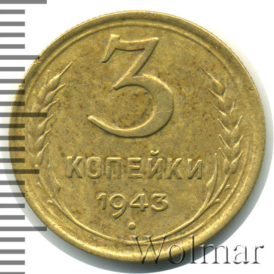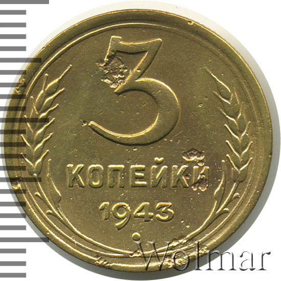Чеканка трёх копеек 1943 года велась на Краснокамском монетном дворе, куда был эвакуирован в 1941 году, из блокадного города, ЛМД (Ленинградский монетный двор). Один из пяти номиналов, произведённых в 1943 году, для денежного обращения. Тираж большой, монета встречается регулярно, поэтому цена на 3 коп. 1943 не большая.