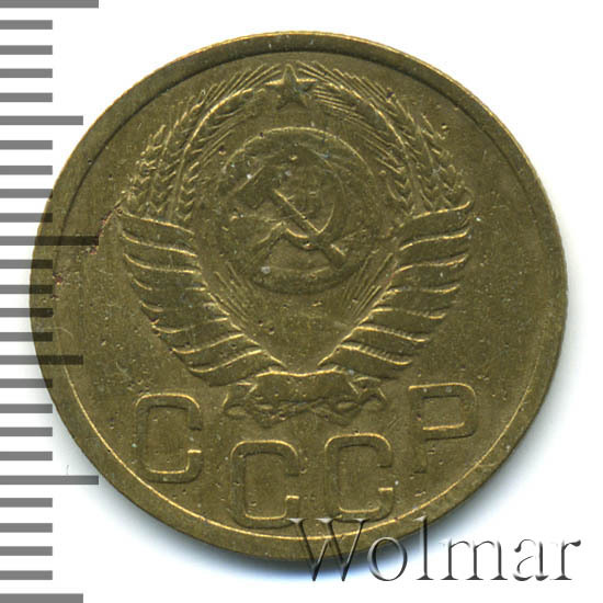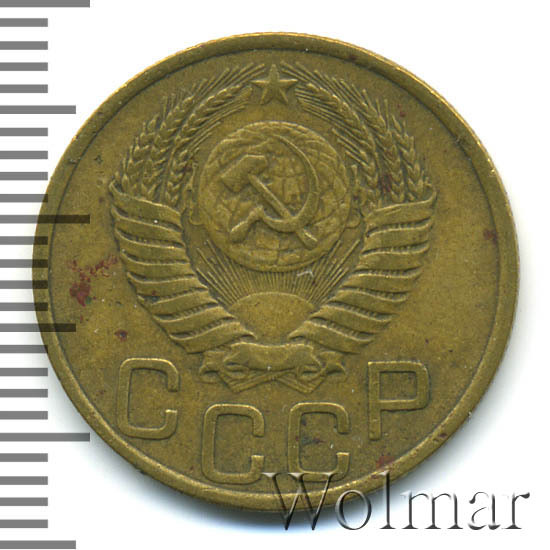 Монета регулярного выпуска для денежного обращения СССР. Чеканка Ленинградского монетного двора (ЛМД). Изготовлена: из немагнитного сплава алюминиевой бронзы, желтого цвета. Официальных данных о тираже нет. Расположение аверса к реверсу – медальное (0 градусов), как и всех монет Советского Союза. Геометрические и весовые параметры трёхкопеечных монет образца 1948 – 1957 гг.