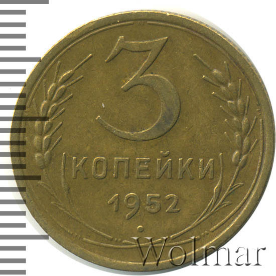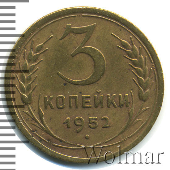 Три копейки 1952 г. разменная монета, одна из семи номиналов регулярного чекана, выпущенных в этом году. Чеканилась из сплава алюминия и бронзы, ЛМД (Ленинградский монетный двор), образца 1948 – 1957 годов. Цену на 3 копейки 1952 года в различном коллекционном состоянии, также стоимость разновидностей этой интересной, преподнесшей нам массу сюрпризов монеты, Вы можете выяснить, посмотрев страницу ниже.