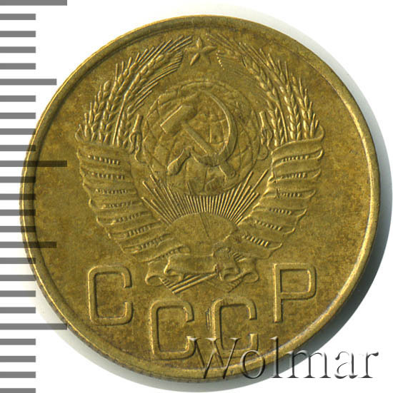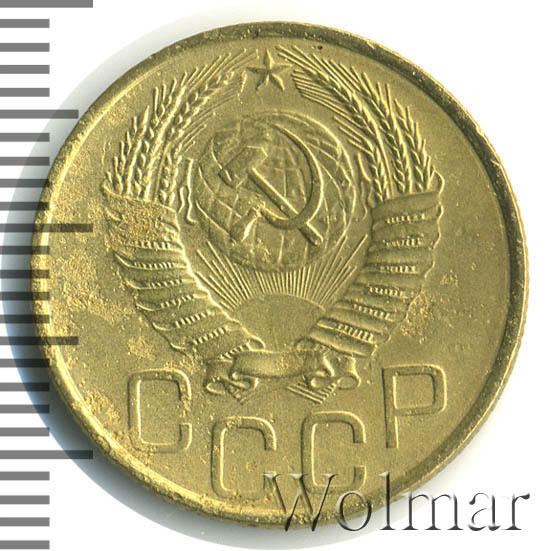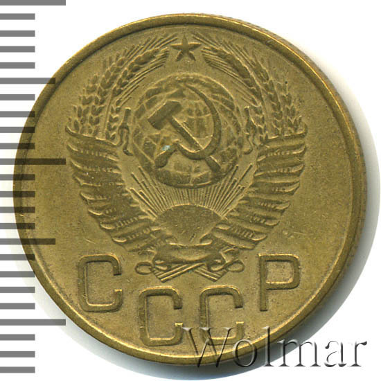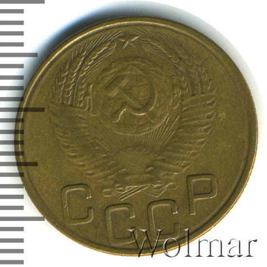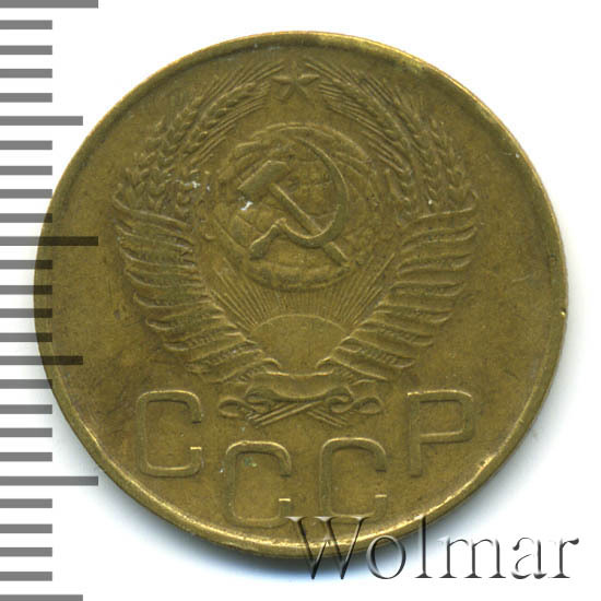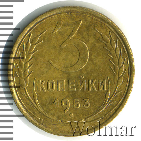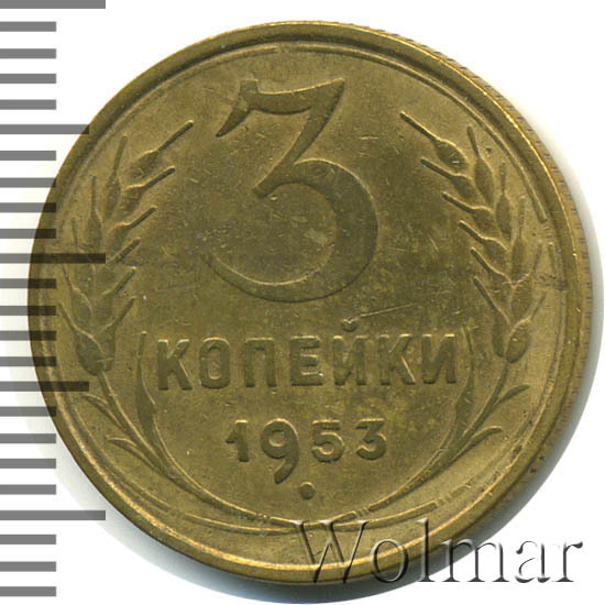 3 копейки 1953 года, часто встречается в погодовки до реформенных монет Советского Союза. Тиражная, разменная монета, один из 7 номиналов регулярного чекана, выпущенных в этом году. Чеканилась из сплава алюминия и бронзы, ЛМД (Ленинградский монетный двор), образца 1948 – 1957 годов. Известны две (см. описание гербовой стороны) разновидности 3 копеек 1953. Самая дорогая и известная шт. 4.1 от 20 копеек 1953 г. (Ф№128). Оценка 1500$ в отличном состоянии.