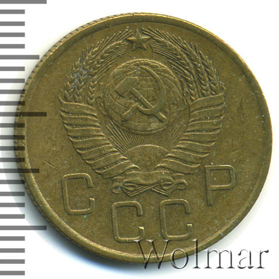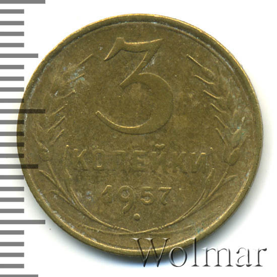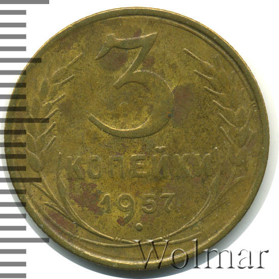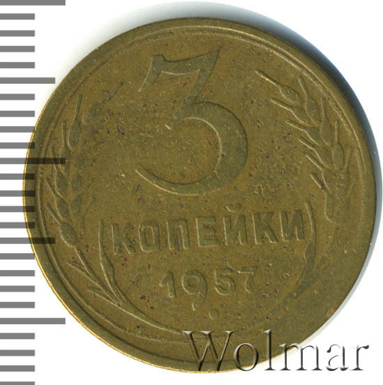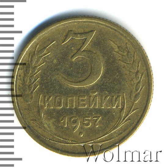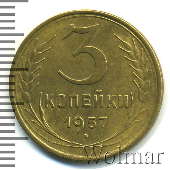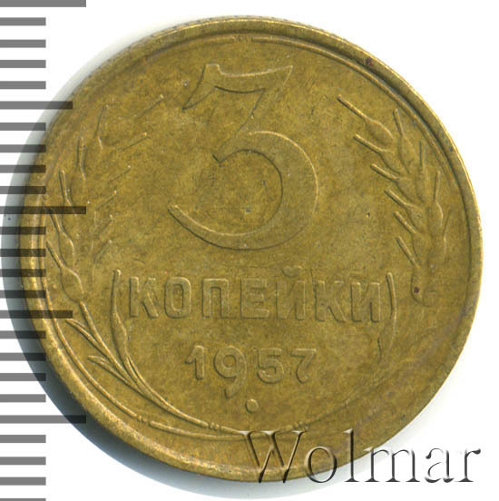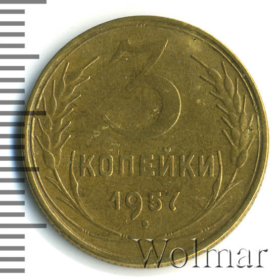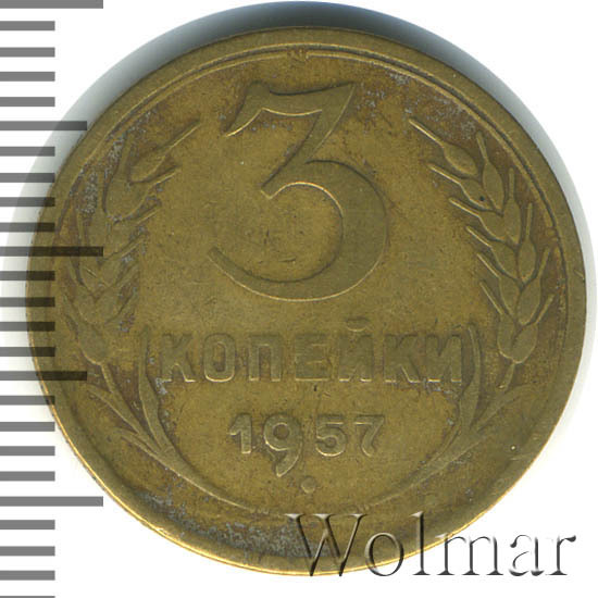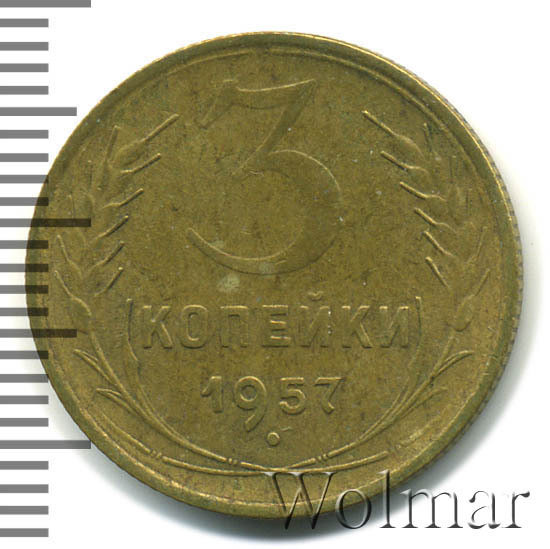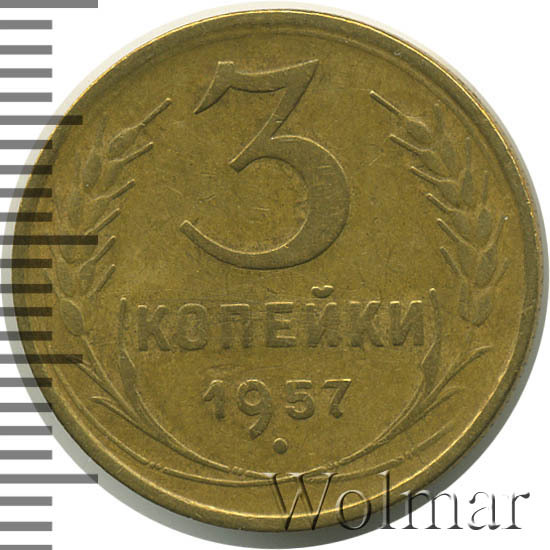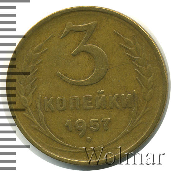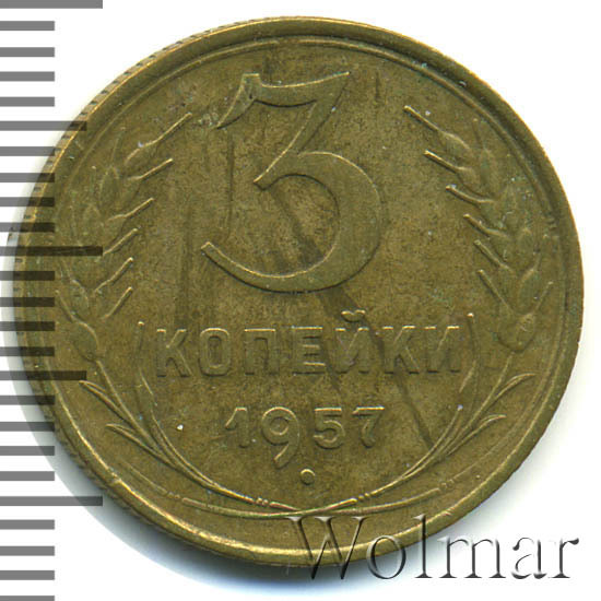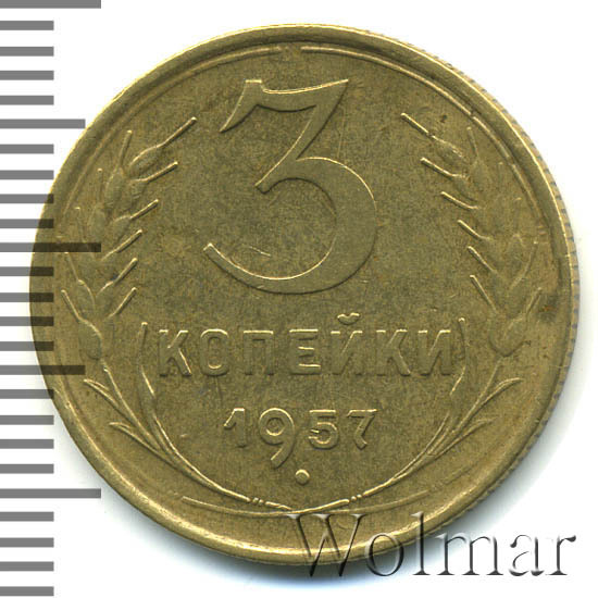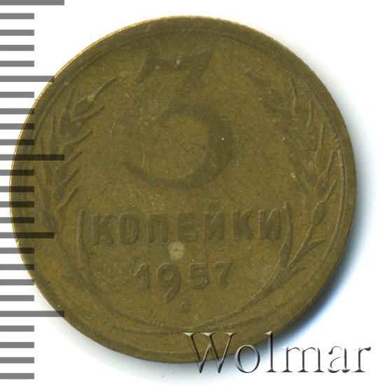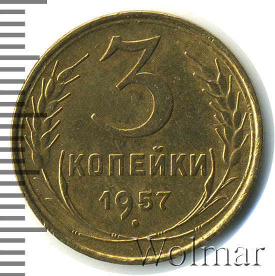 Цена 3-х копеек 1957г. обычно не велика, за исключением красивых монет в превосходной сохранности, которые могут стоить в разы дороже. Известна довольно редкая и дорогая разновидность, с лицевым штампом от 3-х копеечника 1954 года, с шестнадцатью витками ленты на гербе СССР, вместо пятнадцати витков, как у простых экземпляров. Узнать актуальную стоимость 3-х копеек 1957г. можно на странице ниже, по нашему каталогу проходов и цен, отмеченных на торгах самых популярных нумизматических аукционов.