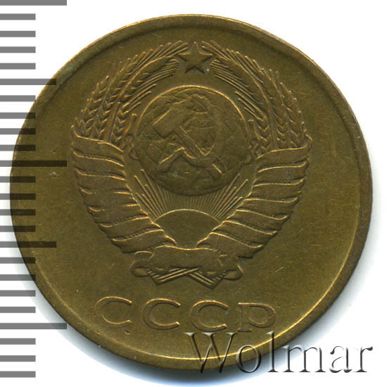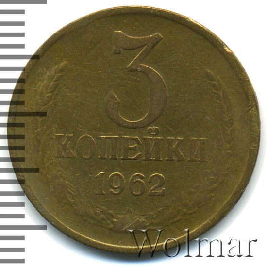 Разновидности две« см. описание аверса», практически равнозначные по встречаемости. Стоимость 3 копеек 1962 повышается в зависимости от состояния. Тип 1961-1991 годов.