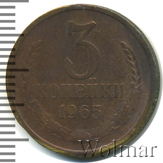 3 копейки 1965 - не частые, особенно в хорошем коллекционном состоянии, поскольку монета была в обороте, т.е. обиходной разменной мелочью в стране до начала 90-ых.