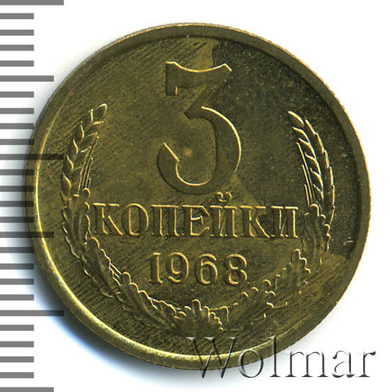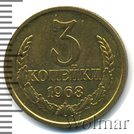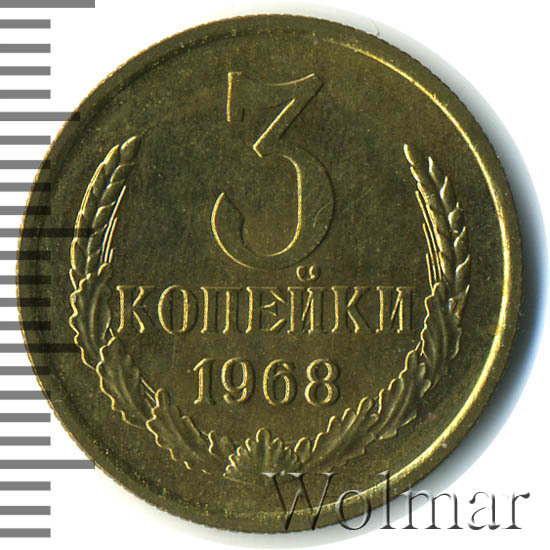 Цена на 3 копейки 1968 г. не велика (в отличие от 10 , 15 и 20 копеек этого года), отличном состоянии (без потертостей и царапин, в штемпельном блеске) может увеличиться в несколько раз. Более подробно ознакомиться с ценой 3 копеек 1968 года, Вы можете во вкладке «стоимость монет», а так же принять участие в текущих аукционах, пройдя по вкладке «активные лоты».
