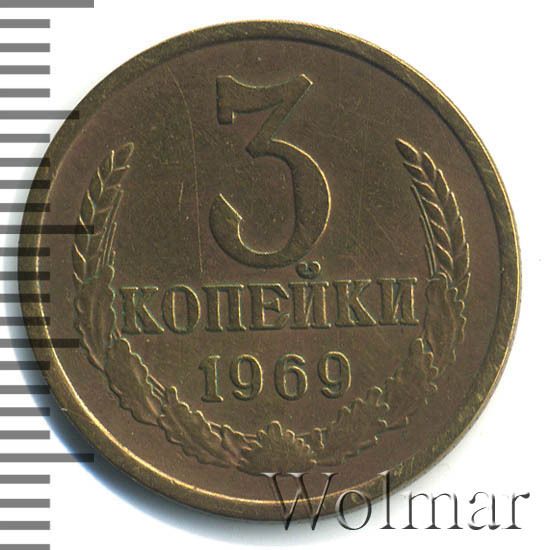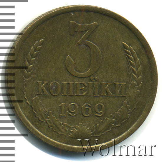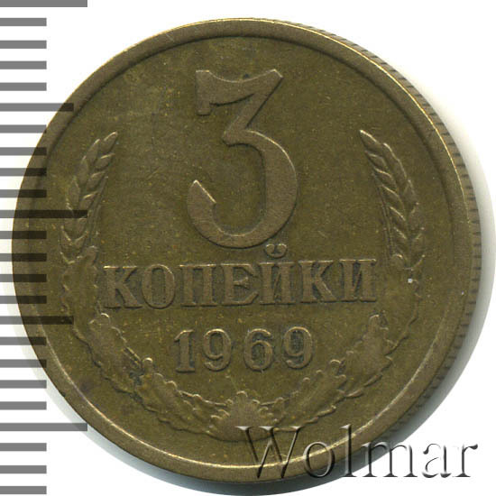 3 копейки 1969 из медно-цинкового сплава весили ровно 3 грамма. Трёшки были оформлены традиционно, согласно стандартам тиражной мелочи 1961 - 1991 годов, герб государства изображён с 15 витками связующей ленты, по числу союзных республик. Стоимость 3 копеек 1969 не большая и напрямую зависит от состояния и привлекательности оцениваемого экземпляра. Разновидностей в этом году, увы, не известно. Более подробно ознакомиться с ценой 3 копеек 1969 года, Вы можете во вкладке "стоимость монет", так же Вы можете принять непосредственное участие в текущих нумизматических интернет - аукционах, во вкладке "активные лоты".
