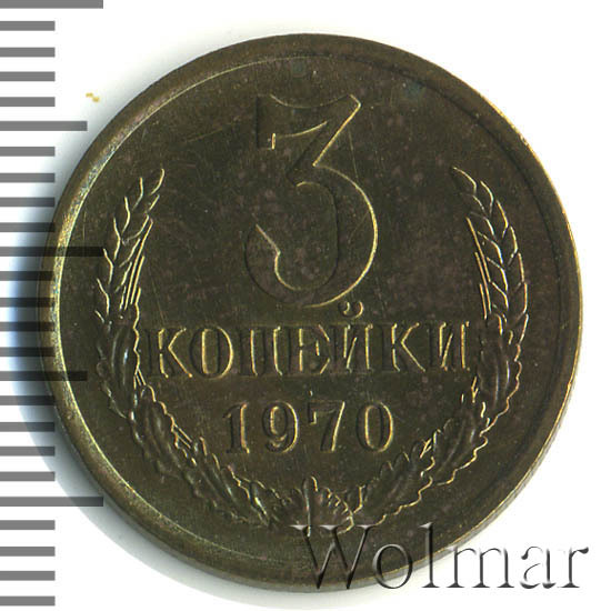 3 копейки 1970 – очень частая монета, даже в хорошем, коллекционном состоянии. Тираж большой. В обороте, т.е. в денежном обращении, встречалась регулярно, вплоть до 1991 г., года развала СССР. Чеканка Ленинградского монетного двора. Производились из медно – цинкового сплава, желтого цвета. По цене ни как не отличается от стоимости, в идентичном состоянии, рядовых, после реформенных трёшек Советского Союза, в отличие от пяти копеек, этого же года. Вариант разновидностей штемпелей – один (см. описание аверса и реверса).