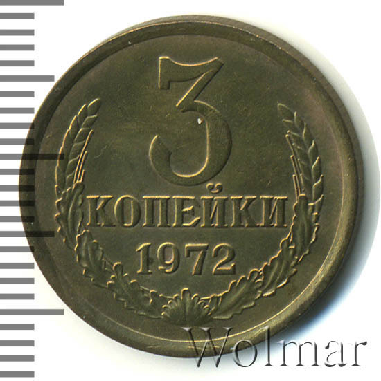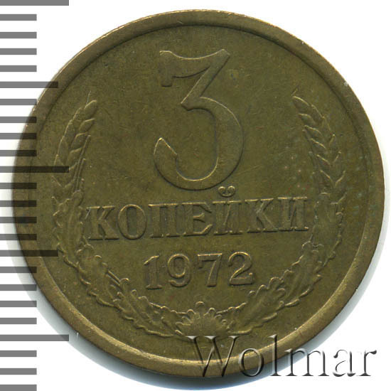 Часто встречается при разборе советской "мелочи", в отличие от 50 копеек 1972. Гурт рифленый, толщина 1,25 мм, два варианта по количеству рифлений (124 и 125). Чеканка Ленинградского монетного двора (ЛМД). На 3 копеек 1972 г.существует два варианта аверса (шт. 2.2 и шт. 2.3, см. описание сторон монеты). Цена на них (в одинаковой сохранности) практически идентична. Цена, на 3 копейки 1972 даже в отличном качестве, минимальна, что и показывают результаты торгов, на данную монетку, самых крупных интернет аукционов, представленных на странице ниже .