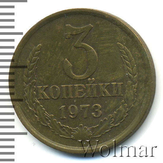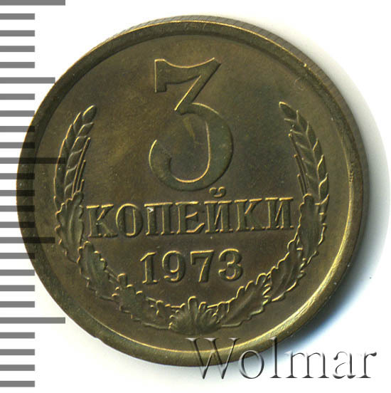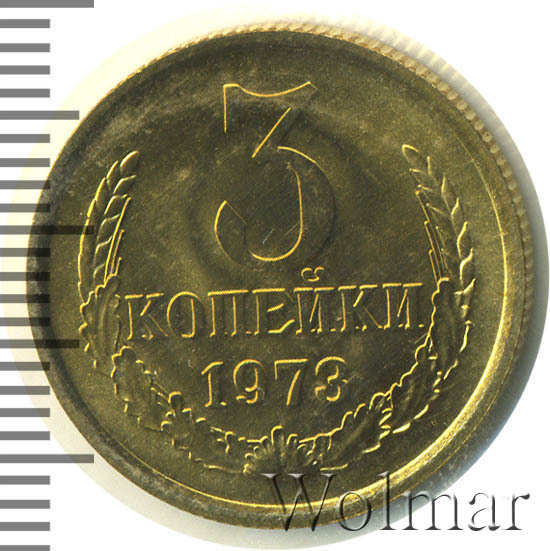 Тиражная, разменная монета номиналом в 3 копейки. Один из 9 номиналов для денежного обращения СССР, отчеканенных на Ленинградском монетном дворе в 1973 году. Часто встречается в погодовки Советского Союза. Цена на монетку не велика, даже в отличном состоянии. Чеканились как для обращения, так и для наборов Гос.Банка СССР (улучшенного качества). Металл изготовления: медно – цинковый сплав, желтого цвета. Отношение сторон монеты друг другу – медальное (0 градусов). Разновидности четыре (см. описание аверса и реверса).