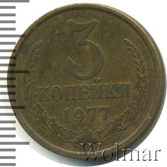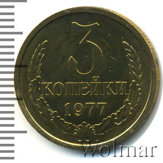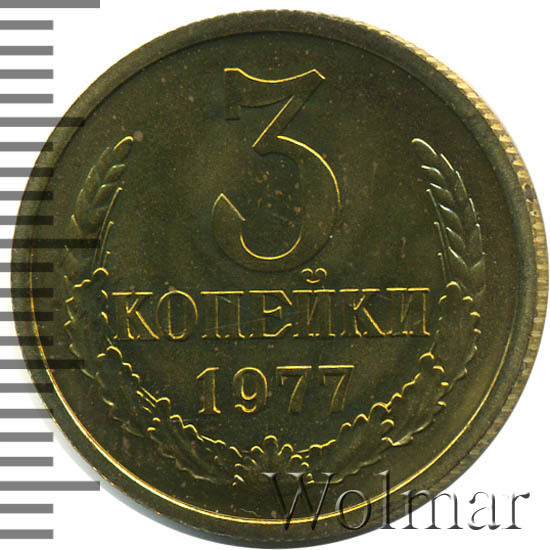 Три копейки 1977 коллекционерам известны в нескольких штемпельных разновидностях. Самыми дорогими считаются монеты с уменьшенным размером герба, выпущенные в наборах Госбанка СССР специально для реализации среди нумизматов. Так же известны трёшки с лицевой стороной от 20 копеек 1973 года, у которых поверхность витков ленты плоская, а вторые колосья без остей (шт.1.2). Более подробно ознакомиться с ценой 3 копеек 1977 года, Вы можете во вкладке "стоимость монет", так же Вы сможете принять участие в текущих нумизматических интернет - аукционах, во вкладке "активные лоты".