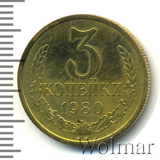 Трёхкопеечная монета, отчеканена в 1980 году, как ещё восемь номиналов разменных монет СССР, для денежного обращения. Чеканка велась на Ленинградском монетном дворе, медно-цинкового немагнитного сплава, желтого цвета. Очень часто встречается в советской погодовки. Отношение сторон монеты (аверса и реверса) друг другу – медальное (0 градусов).