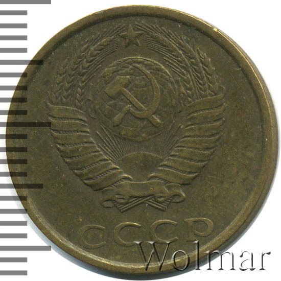 Штемпель 3.3. герб приподнят к выступающему канту монеты, между вторым и третьим колосом нет выходящей ости, на африканском континенте Гвинейский залив четко выражен, герб СССР - 15 витков ленты.