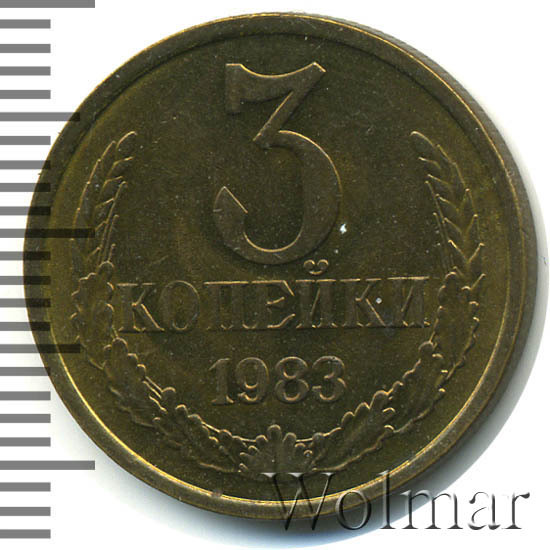 Рядовая разменная монета. Один из девяти номиналов отчеканенных на Ленинградском монетном дворе в 1983 году. Тираж неизвестен, но 3 коп. 1983 массово встречается в погодовки позднего СССР, чеканились как для обращения, так и для наборов Гос.Банка (улучшенного качества). Металл изготовления: медно – цинковый сплав, желтого цвета, соостность (отношение аверса к реверсу) – медальная. В данном разделе каталога рассмотрены две разновидности (см. описание аверса) трёх копеек 1983 года. Эти разновидности равнозначны по цене и встречаемости. Представляют нумизматитеский интерес только в качестве UNC. Вариант трёх копеек с гербовой стороной от 20 копеек 1980 г., расположен в отдельном разделе каталога. Тип 1961-1991 годов.