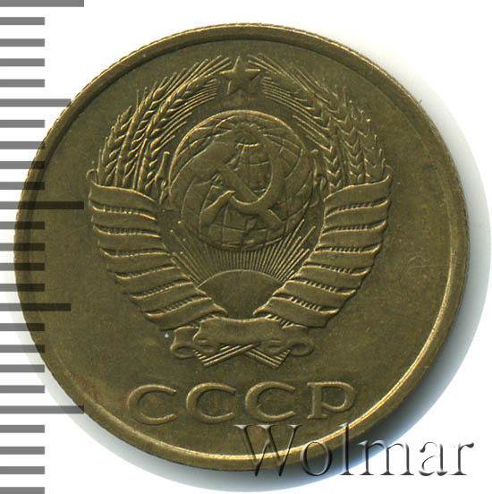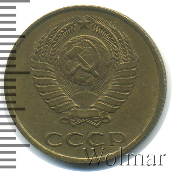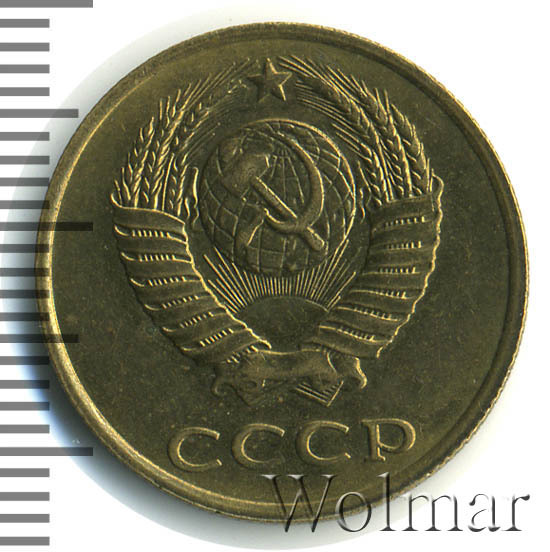 Штемпель 3.3. герб приподнят к выступающему канту монеты, между вторым и третьим колосом нет выходящей ости, на африканском континенте Гвинейский залив четко выражен, герб СССР - 15 витков ленты.