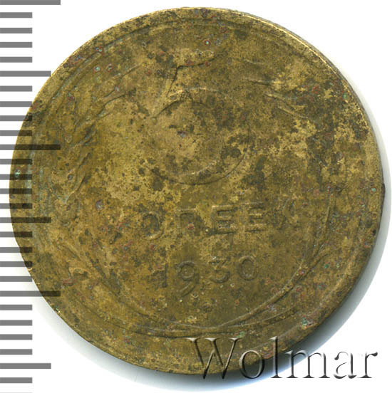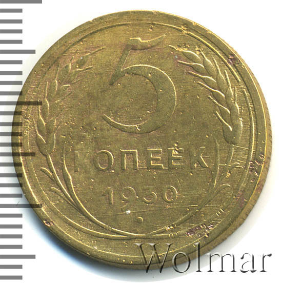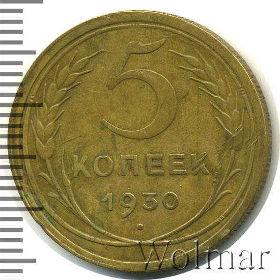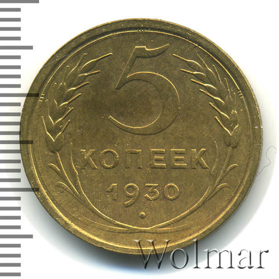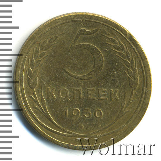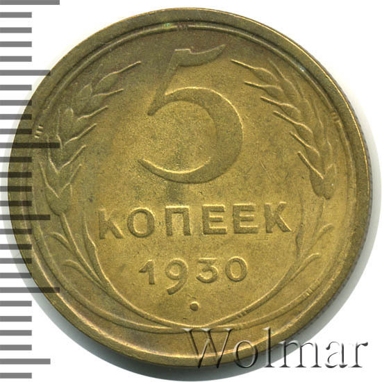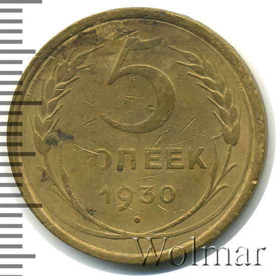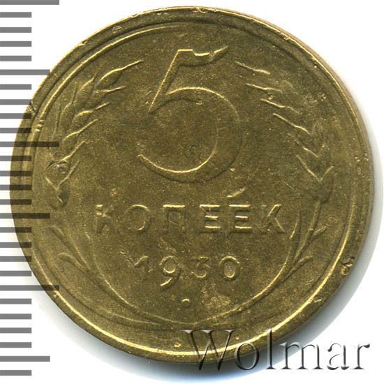 5 копеек чеканили из алюминиевой бронзы, материала достаточно лёгкого, но мягкого и подверженного коррозии, вследствии чего, часто встречаются монеты с кавернами и разрушающимся полем. Давайте подробнее остановимся на стоимости данной монеты. Цена 5 копеек 1930г. не велика, нумизматы считают монету довольно распространённой. Штемпельных разновидностей у пятаков этого года не известно.