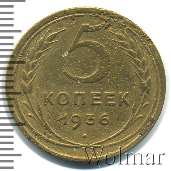 Пять копеек 1936 года чеканили на Ленинградском монетном дворе, светло – золотистого сплава алюминиевой бронзы, немагнитного материала достаточно лёгкого, но подверженного коррозии. Вследствие этого, не много монет дошли до нас в хорошем, коллекционном состоянии. Поэтому цена на 5 копеек 1936 г., в качестве выше VF+, в несколько раз превышает стоимость корродированных монет, которые в основном и встречаются. Тираж не большой: 5241 тысяч штук. Тип 1935 – 1937 гг. (семь связующих лент в гербе).