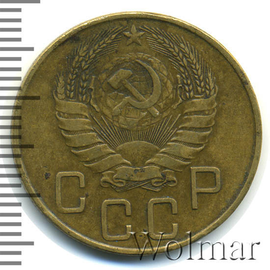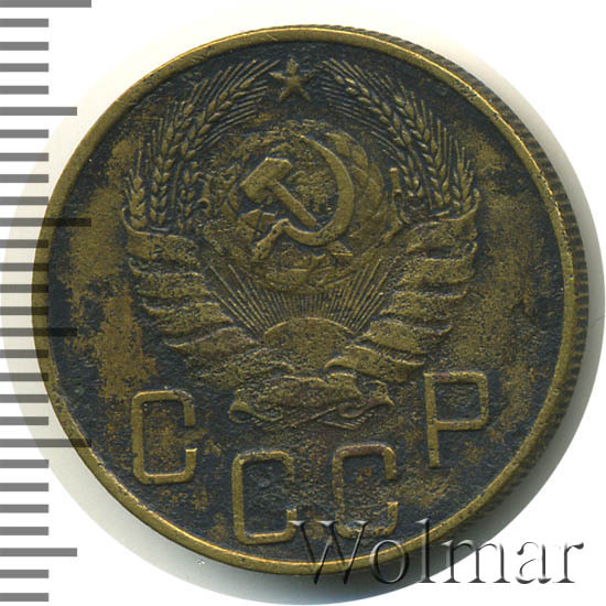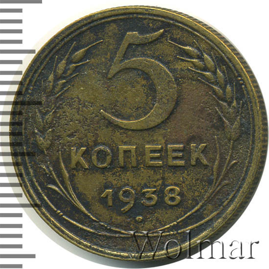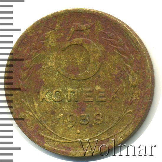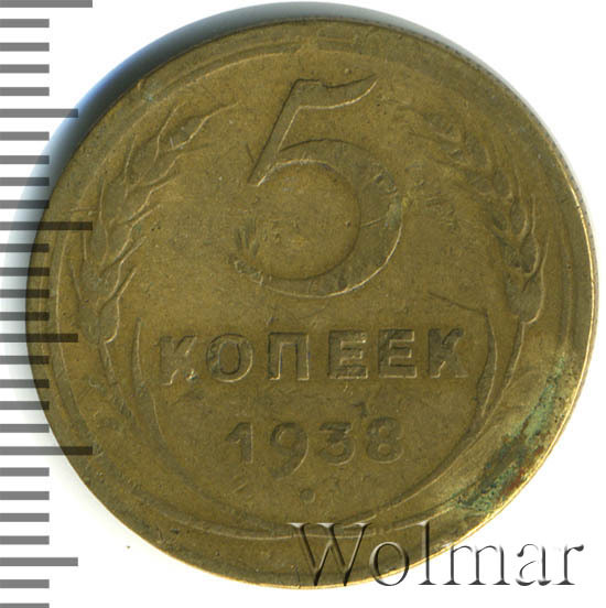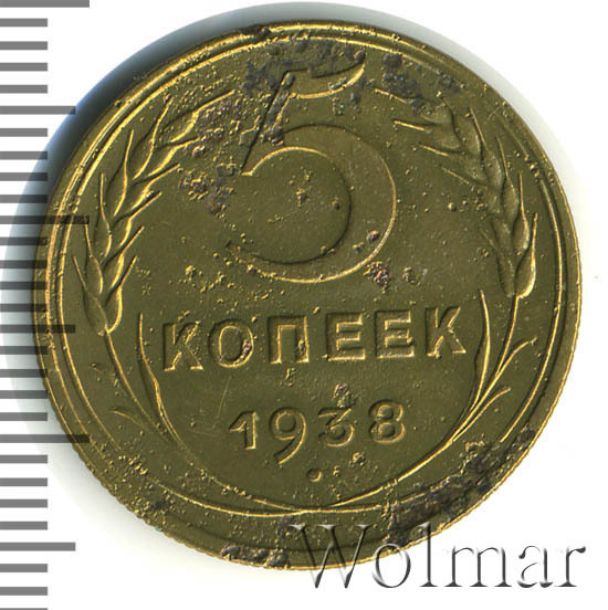 5 копеек 1938 г - довольно не частая монета в погодовки разменной мелочи советского периода. Чеканили эту монету, как и остальные с датой "1938", на Ленинградском монетном дворе (ныне СПМД, г. Санкт – Петербург) из немагнитного сплава алюминиевой бронзы, жёлтого, лёгкого, но довольно мягкого материала, подверженного коррозии, вследствие этого, часто встречаются 5 коп. 1938 г. с кавернами и корродированным полем. Цена таких экземпляров не высока, в отличие от первозданно сохранившихся, с момента чеканки, монет, стоимость которых, в разы больше. Тип 1935 – 1946 гг. Официальных данных о тираже нет. Медальная (0 градусов) соостность сторон.