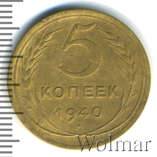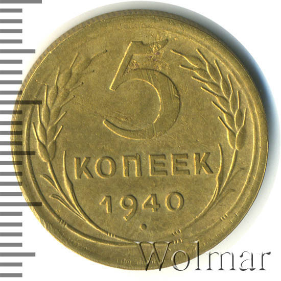 Пять копеек 1940 г. тиражная монета СССР. Один из 7 номиналов (от 1 до 20 копеек) выпущенных в денежное обращение в сороковом году. Чеканилась на ЛМД из алюминиевой бронзы. Отношение лицевой стороны (аверс) к оборотной (реверс) – медальное.