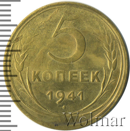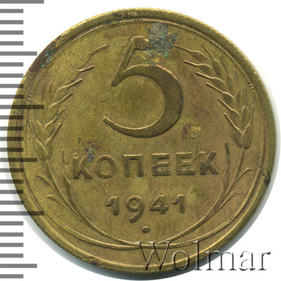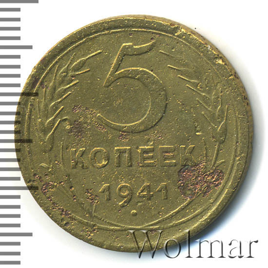 5 копеек 1941 г. чеканили из немагнитного сплава алюминиевой бронзы, золотисто – жёлтого, лёгкого, но достаточно мягкого материала, подверженного коррозии, вследствие чего, часто встречаются монеты корродированным полем. Цена таких монеток не высока, в отличие пяти копеек сорок первого года с не повреждённым временем (без следов хождения, в штемпельном блеске). Стоимость таких экземпляров пяти копеек 1941 года в разы выше. Тип 1935 – 1946 гг. Тираж, до сегодняшнего дня, не известен. Отношение гербовой стороны к оборотной – медальное (0 градусов). Разновидностей две (см. описание аверса и реверса) - не значительные.