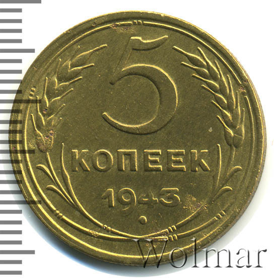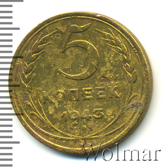 Разменная монета в 5 копеек, один из пяти номиналов, выпущенных с Краснокамского монетного двора (ЛМД) в сорок третьем году. Мелкие номиналы в одну и две копейки, из-за экономии ресурсов страны в военное время, в 1943 году не чеканились. Материал изготовления: немагнитный сплав алюминиевой бронзы, желтого цвета. Отношение гербовой стороны и оборотной (аверса к реверсу) – медальное. Тираж доподлинно не известен.