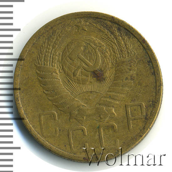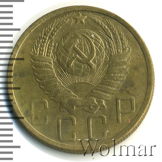 Чеканка Ленинградского монетного двора. Материал изготовления: немагнитный сплав алюминиевой бронзы, жёлтого цвета. Соосность сторон монеты - 0 градусов (медальная). Тип 1948 – 1957 гг.