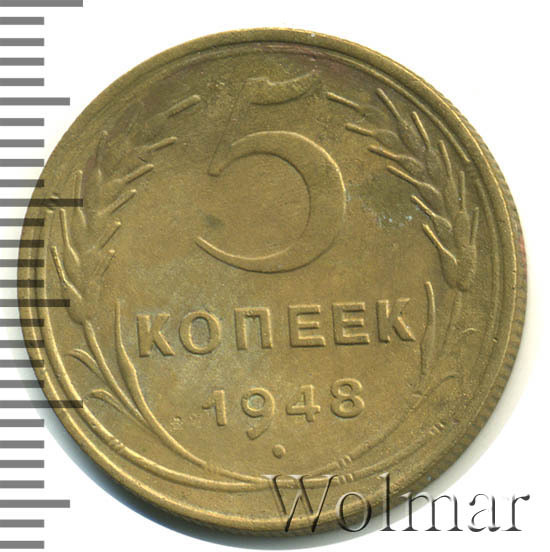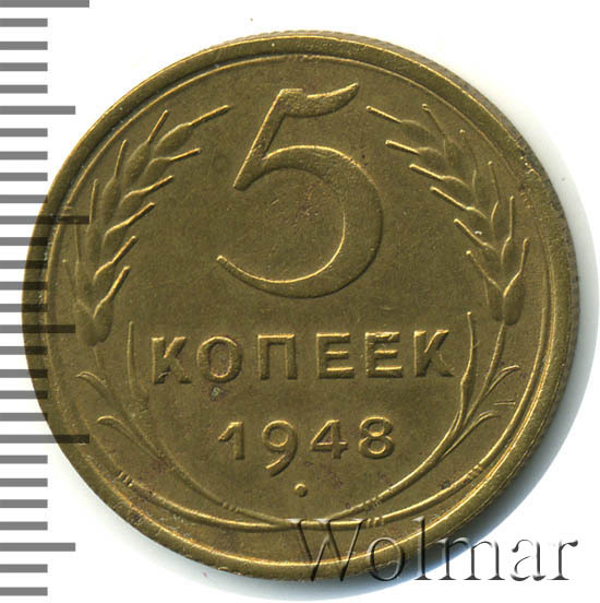 Известных штемпельных разновидностей – четыре. По цене, 5 коп. 1948 г. со шт. 1.12А (Ф№55), превосходит в несколько раз остальные. Цена 5 копеек 1948 г., сильно зависит от нумизматической привлекательности и состояния конкретного экземпляра. Подробно ознакомиться с ценой 5 копеек 1948 года, Вы можете во вкладке «стоимость монет», а так же принять участие в текущих аукционах, заглянув во вкладку «активные лоты».