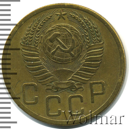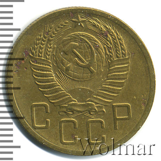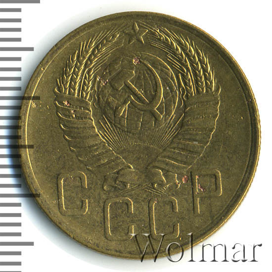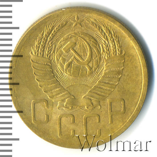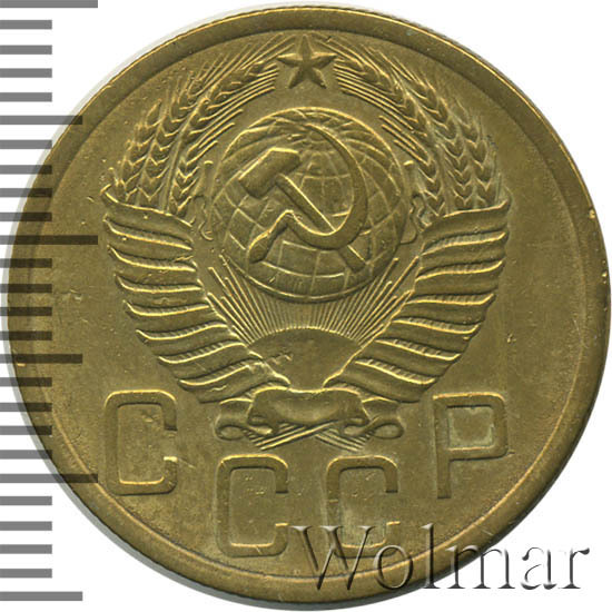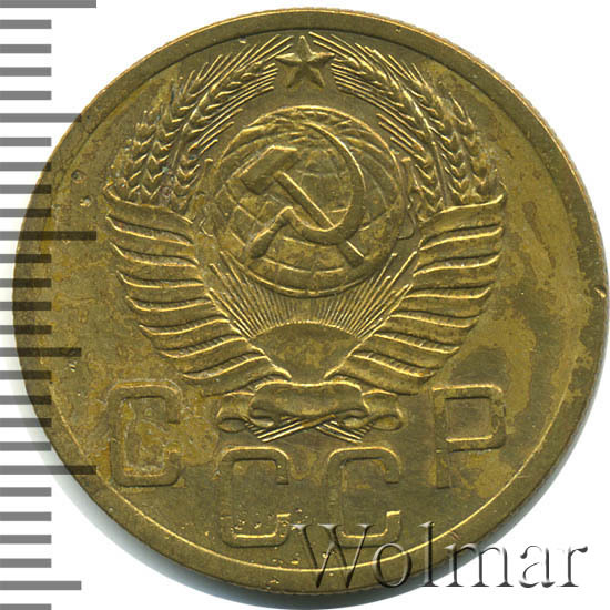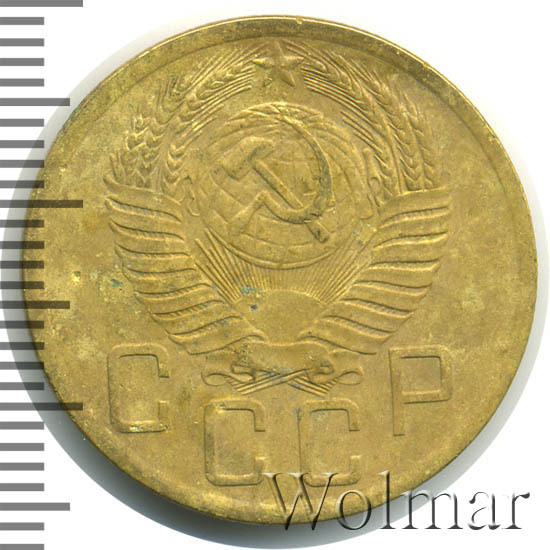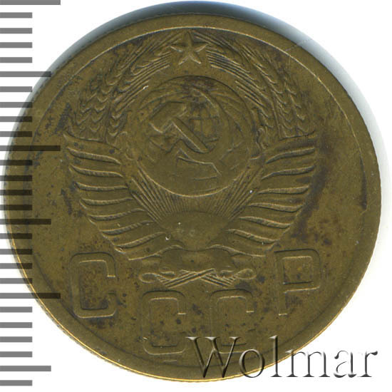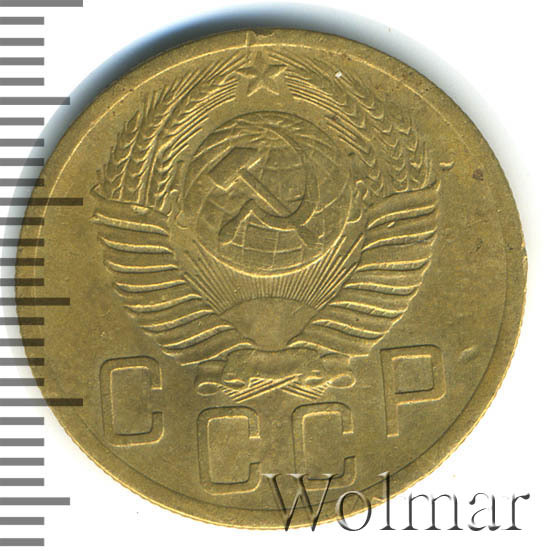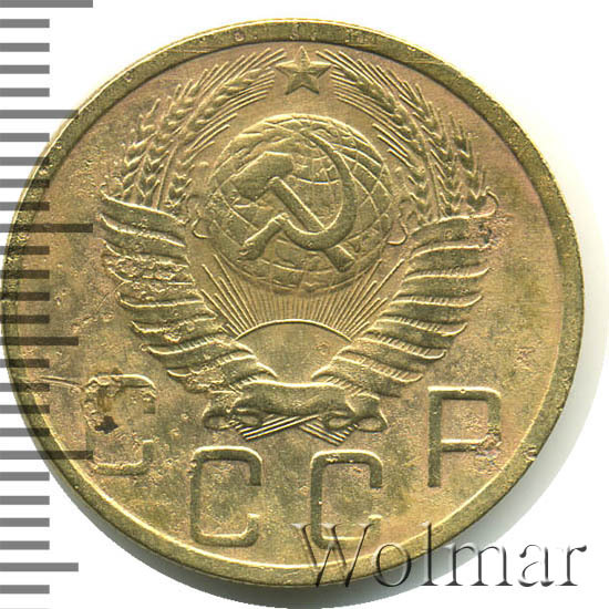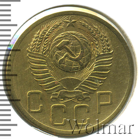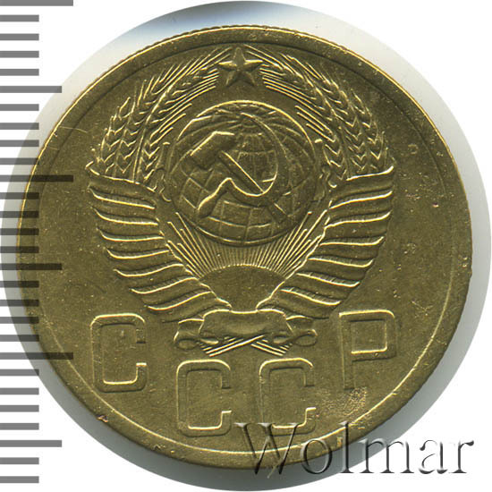 Пятикопеечная монета, для денежного обращения СССР. Металл изготовления: немагнитный монетный алюминиевой - бронзовый сплав, желтого цвета, соостность (отношение аверса к реверсу) – медальная. Тип 1948 – 1957 годов.