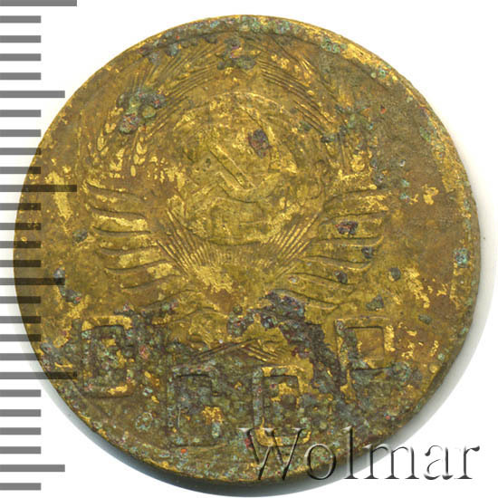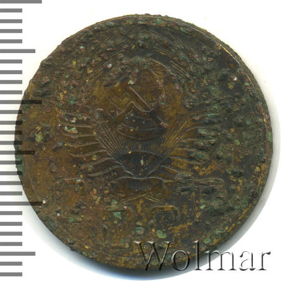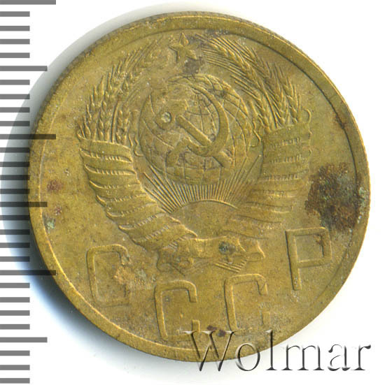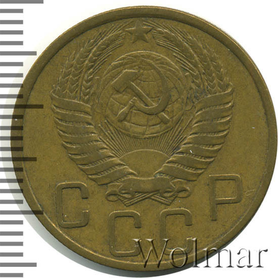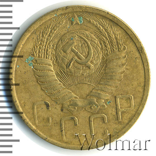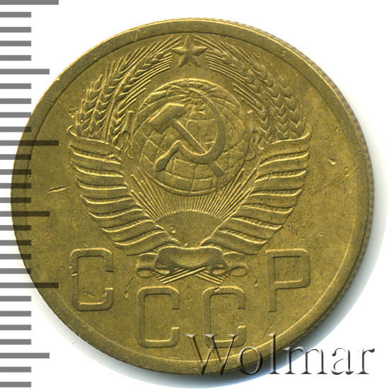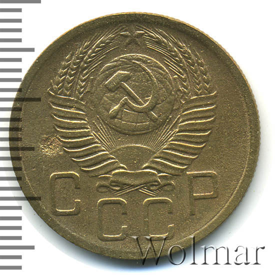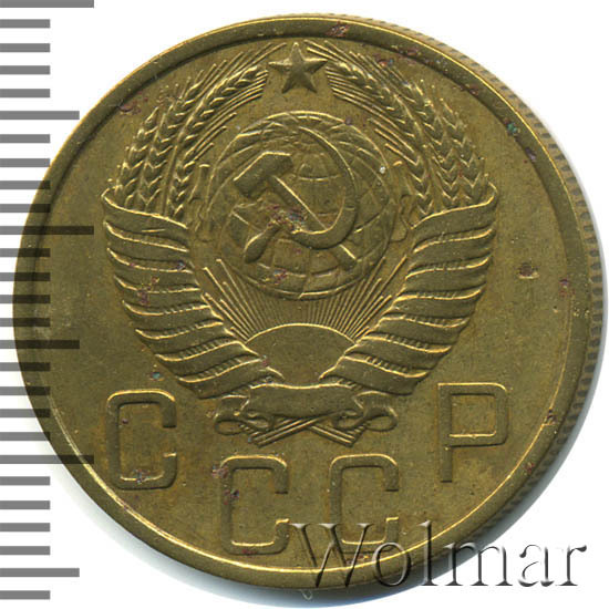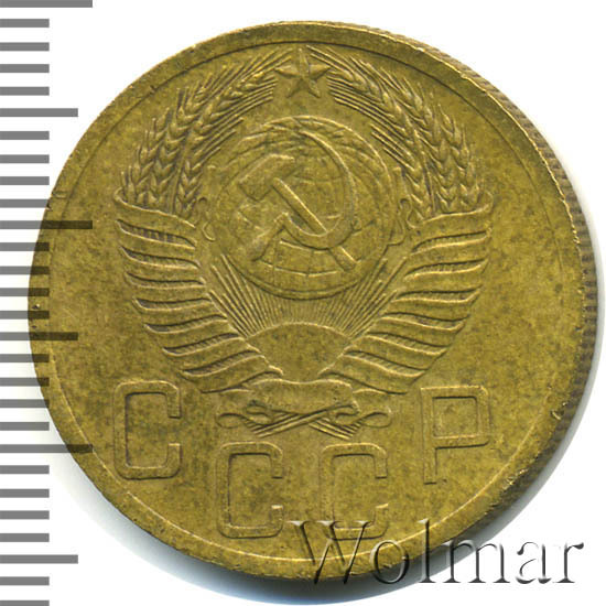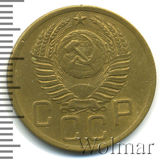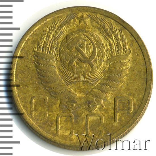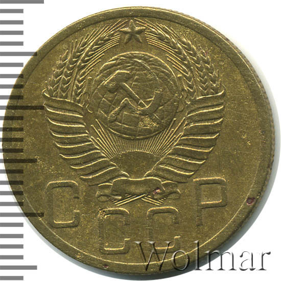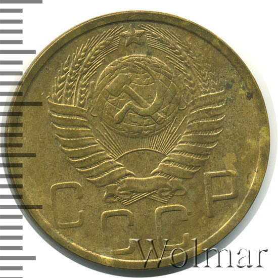 Пятикопеечная монета, для денежного обращения СССР. Металл изготовления: немагнитный монетный алюминиевой - бронзовый сплав, желтого цвета, соостность (отношение аверса к реверсу) – медальная. Тип 1948 – 1957 годов.