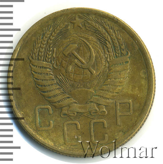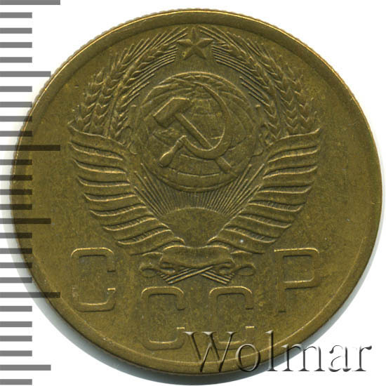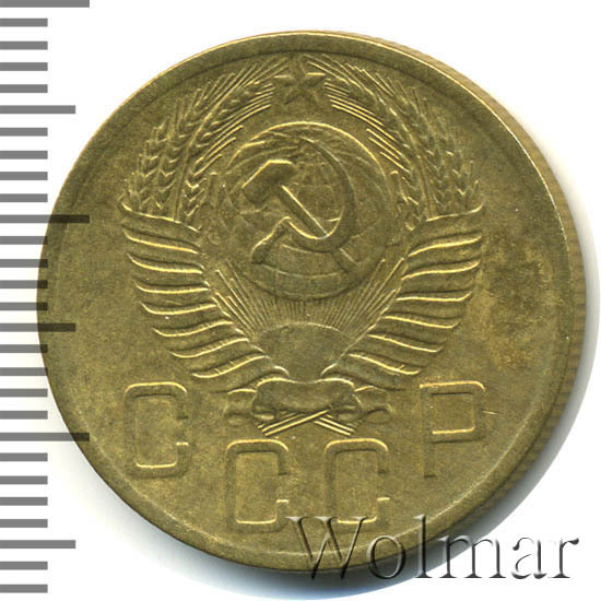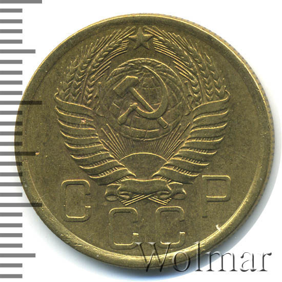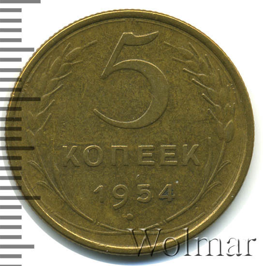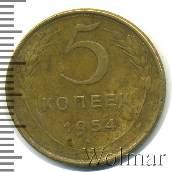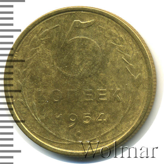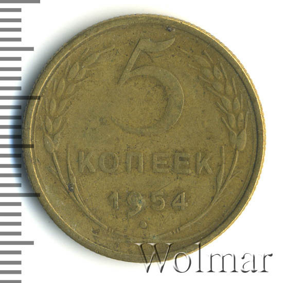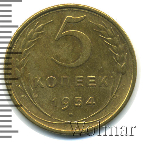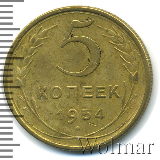 Большой тираж, к сожалению, не позволяет говорить о высокой цене на 5 коп. 1954 г., которая сравнима со стоимостью аналогичных дореформенных бронзовых пятикопеечников с огромными тиражами. Штемпельных разновидностей две (равнозначные по встречаемости и цене). Стоимость 5 копеек 1954 г., сильно зависит от коллекционного состояния конкретного экземпляра. Более подробно ознакомиться с ценой 5 копеек 1954 года, Вы можете во вкладке «стоимость монет», а так же принять участие в текущих интернет - аукционах, пройдя по вкладке «активные лоты».