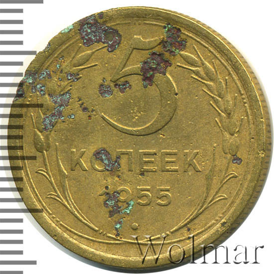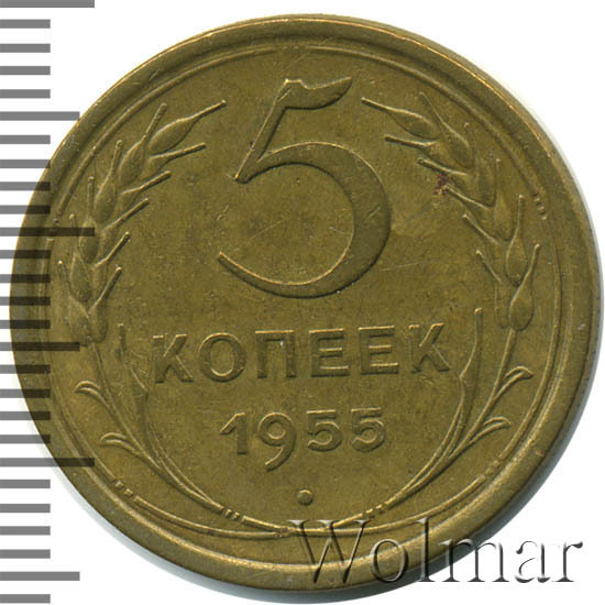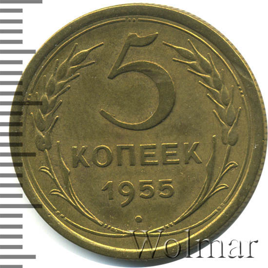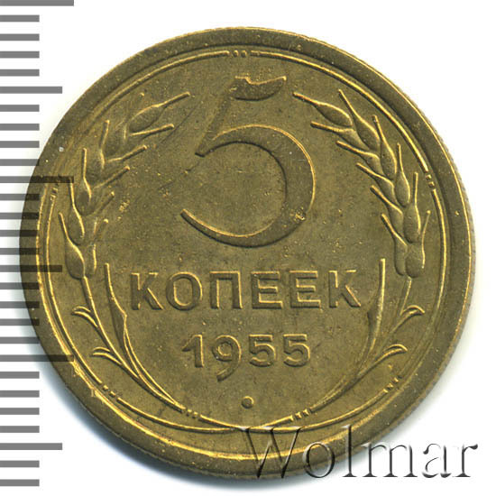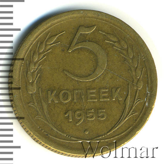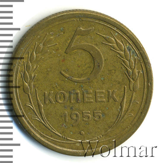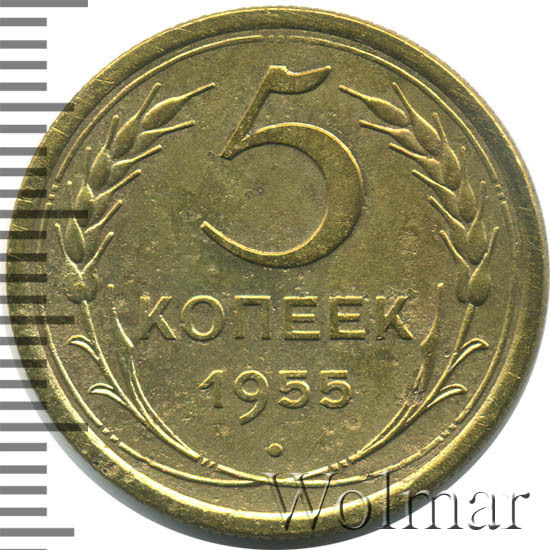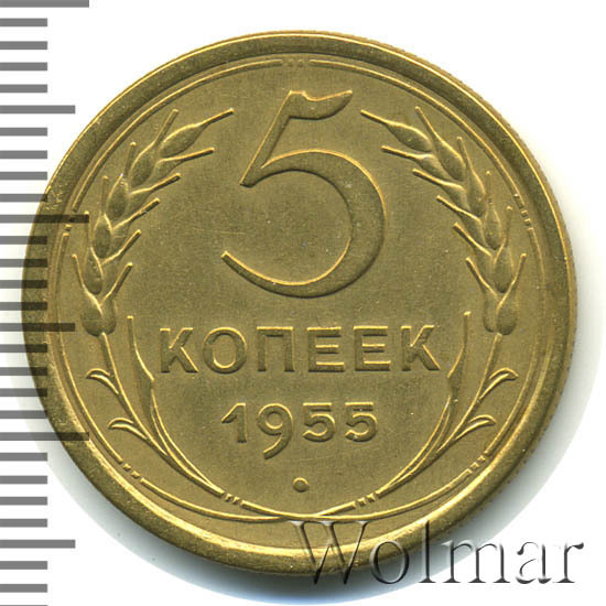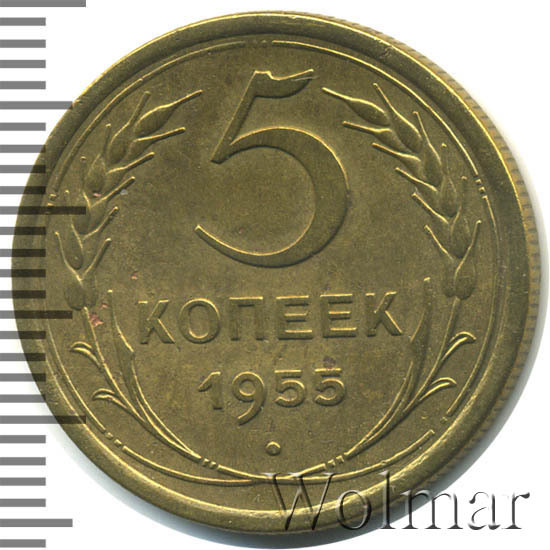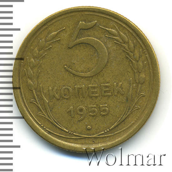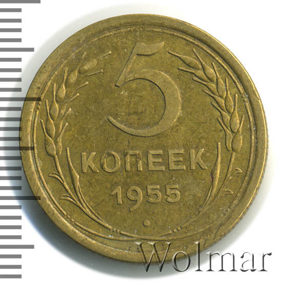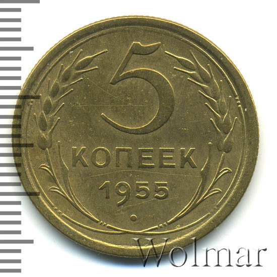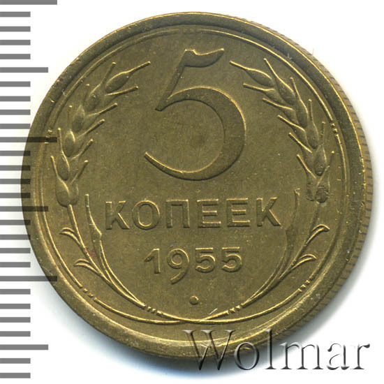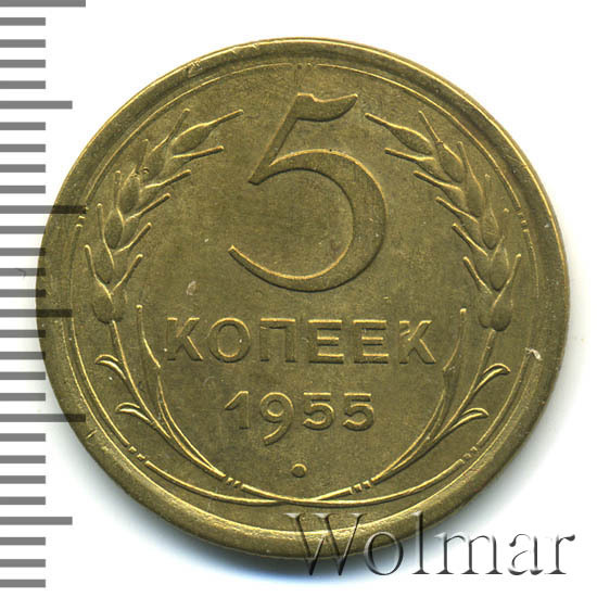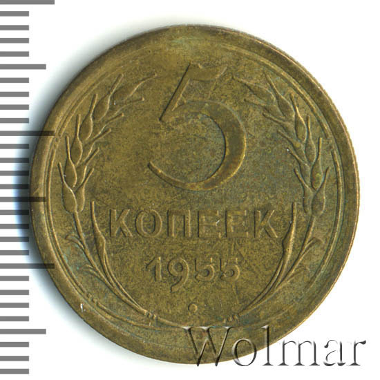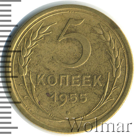 Тиражная пятикопеечная монета, для денежного обращения СССР, тип 1948 – 1957. Отчеканена на Ленинградском монетном дворе, из сплава алюминиевой бронзы. Цена на 5 копеек 1955 г., в не высоком качестве, не большая. Представляет нумизматический интерес только в высоком качестве UNC. Стоимость таких экземпляров 5 коп. 1955 г. в несколько раз выше цены на пятаки в среднем качестве. Известных разновидностей не обнаружено (см. описание сторон монеты). Соостность (отношение аверса к реверсу) медальная. Один из 7 номиналов (номиналы в 50 копеек и в один рубль были введены в денежное обращение с 1961 г.) монет регулярной чеканки Союза Советских Социалистических Республик.