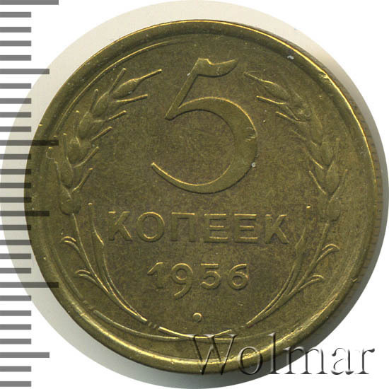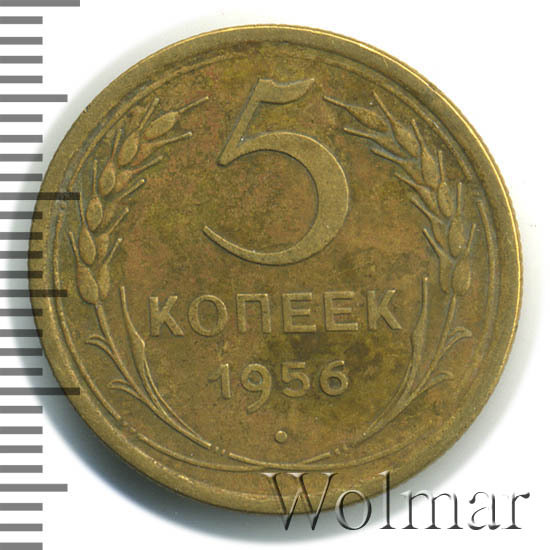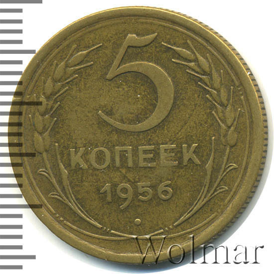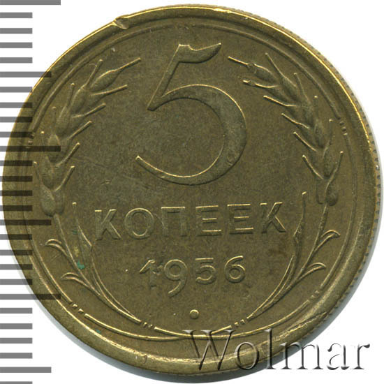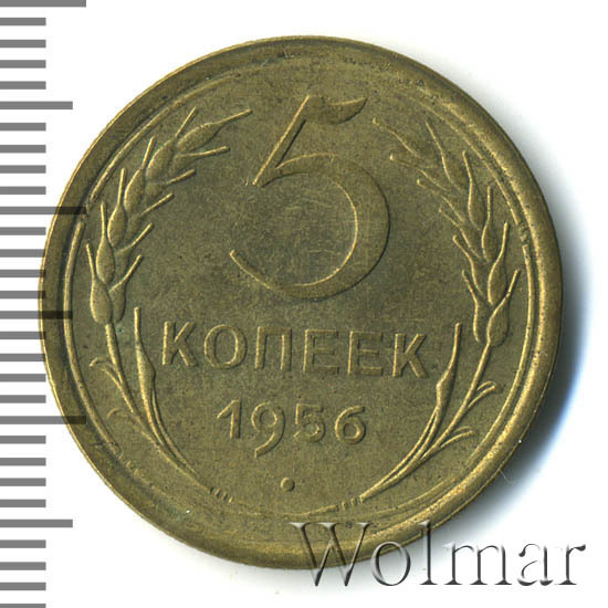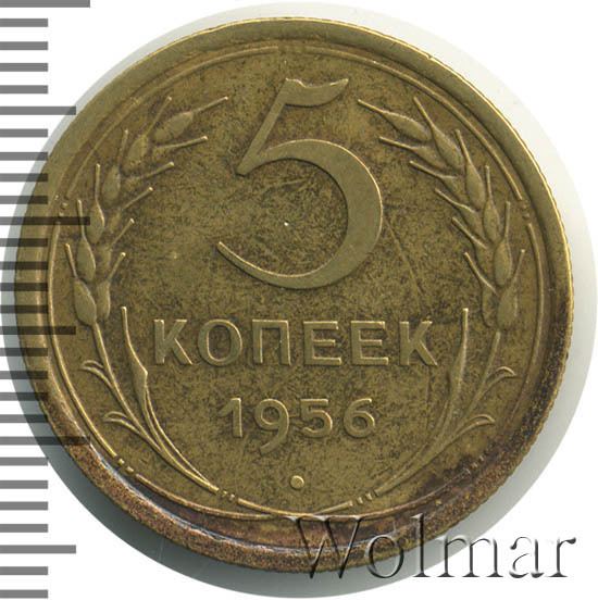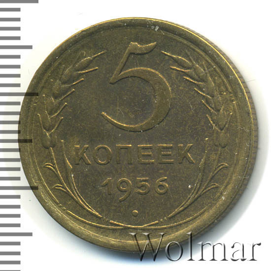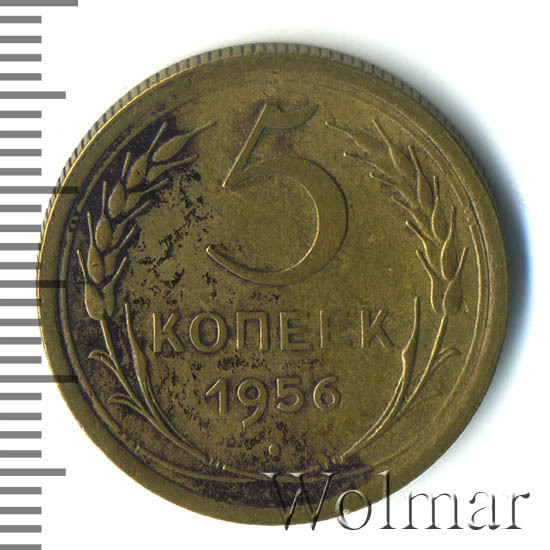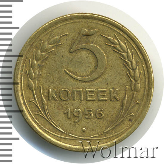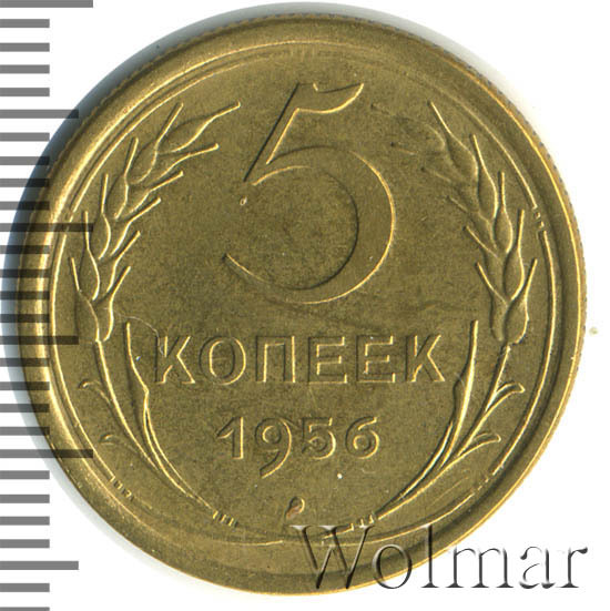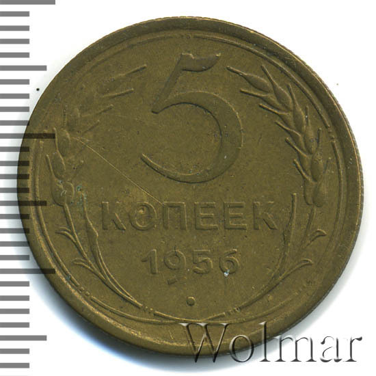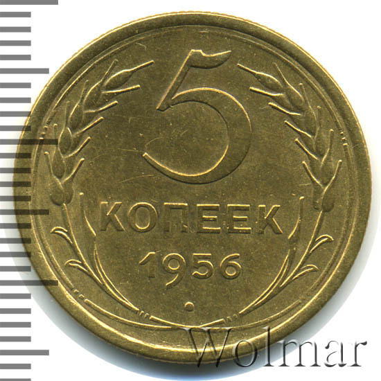 Разновидности по сторонам монеты не обнаружены. Представляет нумизматический интерес только в отличном качестве. Ознакомится с ценой 5 копеек 1956 года, в различном коллекционном состоянии, Вы можете на странице ниже, где приведены статистические данные, построенные на основе прошедших аукционов.