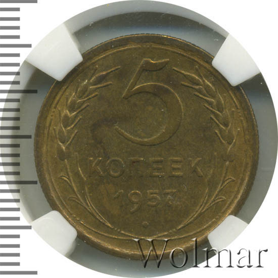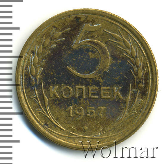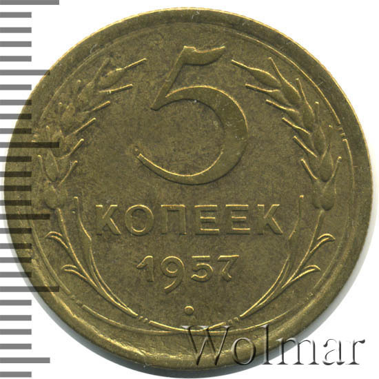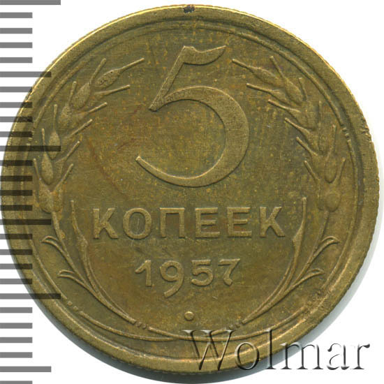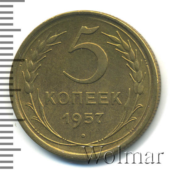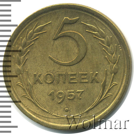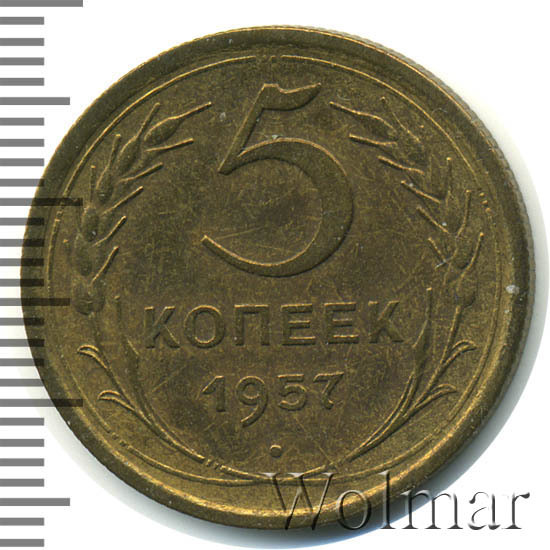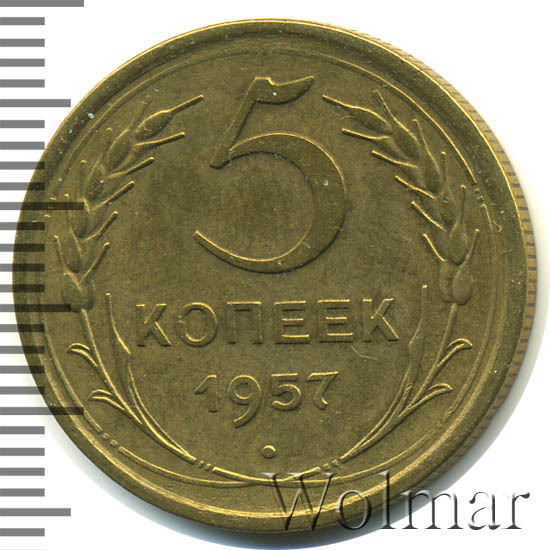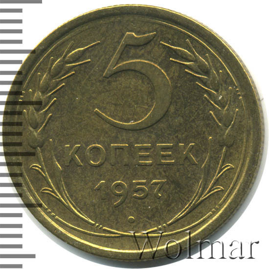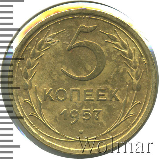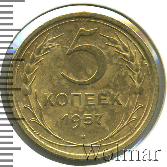5 копеек 1957 г. принадлежит типу 1948 – 1957. Шестнадцать витков связующей ленты в Государственном Гербе СССР. Последний год чекана так называемых дореформенных монет. Один из 7 номиналов (номиналы в 50 копеек и в 1 рубль были введены в денежное обращение с 1961 г.) выпущенных в 1957 году. Этот "пятак" представляет нумизматический интерес только в высоком качестве UNC.