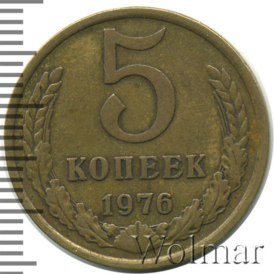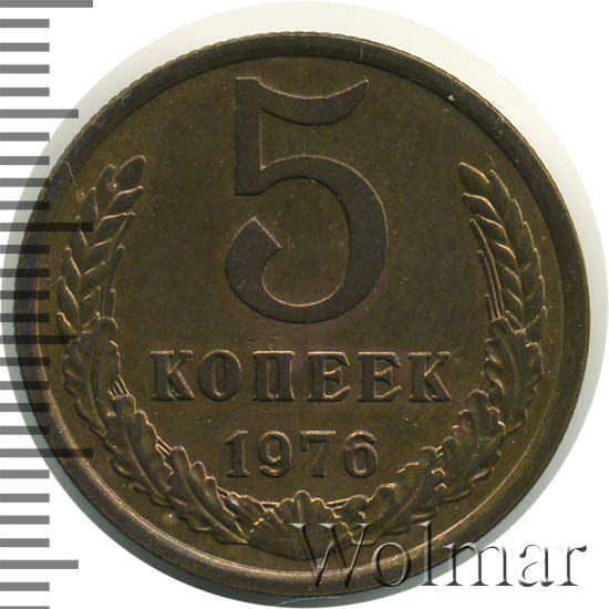 Пять копеек 1976 года - разменная монета для денежного оборота Советского Союза. Была отчеканена в немагнитном медно-цинковом сплаве, желтого цвета Монета в пять копеек 1976 г, чеканилась, как другие номиналы этого года, на Ленинградском монетном дворе (ЛМД). Чеканка велась как для оборота, так и, улучшенного качества, для годовых наборов Госбанка СССР.