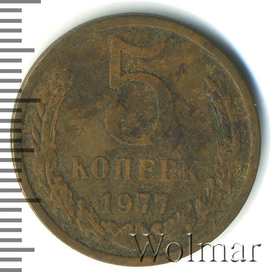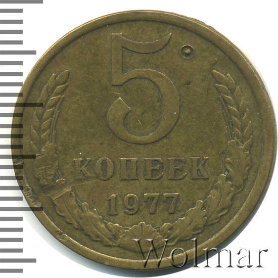 Один из 9 номиналов монет регулярной чеканки для денежного обращения Союза Советских Социалистических Республик, выпущенных в 1977 году. Рядовая, разменная монета. 5 копеек 1977 чеканились как для оборота так и, улучшенного качества, для годовых наборов Государственного Банка СССР. Чеканка Ленинградского монетного двора (ЛМД). Материал изготовления: немагнитный медно – цинковый монетный сплав, желтого цвета. Расположение сторон монеты (аверса к реверсу) – медальное. Тип 1961 – 1991 годов.