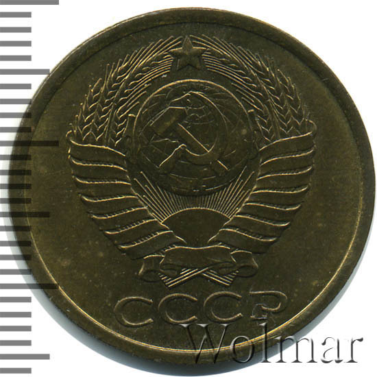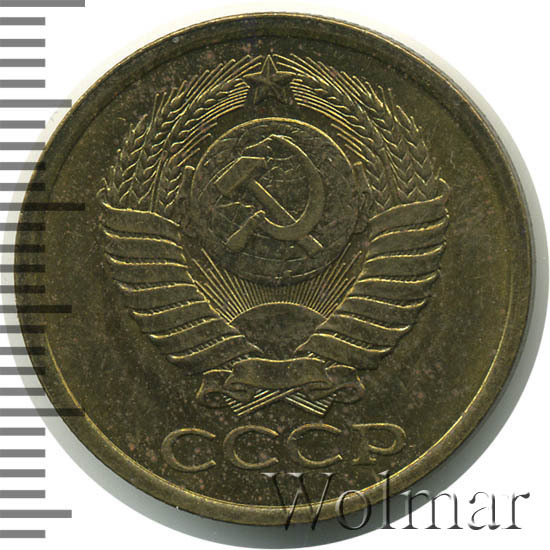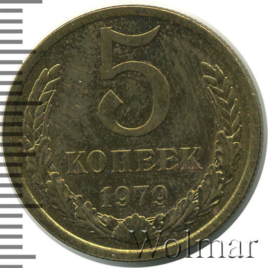 5 копеек 1979 года довольно распространённая тиражная медно-никелевая монета, весом 5 грамм. На аверсе изображён герб страны эмитента - земной шар с серпом и молотом увенчанный пятиконечной звездой, по бокам снопы пшеничных колосьев перевязанные 15 витками ленты с названиями союзных республик (на монетах мелких названий нет из-за высокой сложности оформления). На реверсе - цифры номинала и года чеканки. Выделяют две разновидности, редким считается пятак у которого буква "р" отставлена вправо, а срезы стеблей не соединены линиями, между вторым и третьим нижними витками ленты справа семь стеблей.