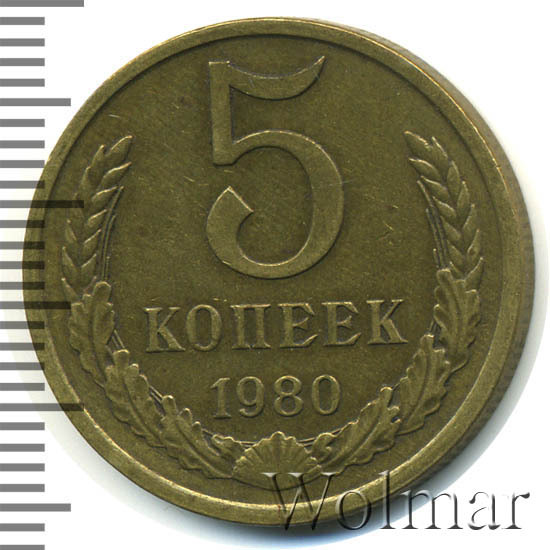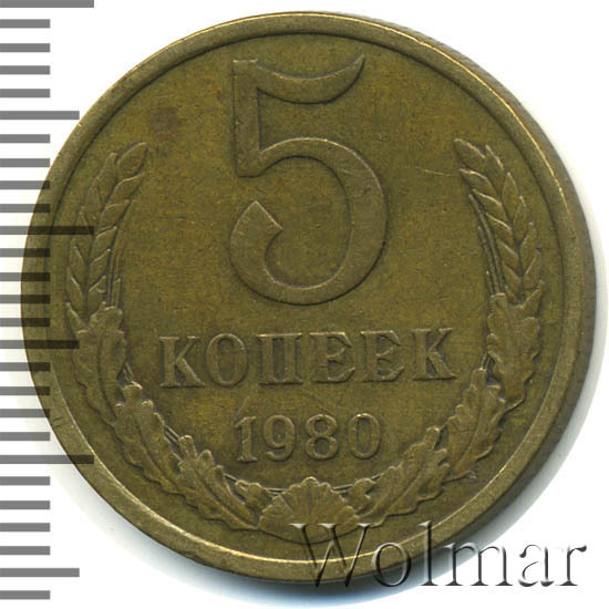 5 копеек 1980 года - простая тиражная монетка весом в пять грамм. Чеканилась из медно-цинкового немагнитного сплава. Тираж пятаков был довольно большим, но, по обыкновению, остался не известным, поскольку такие сведения считались (и ныне считаются) государственной тайной.